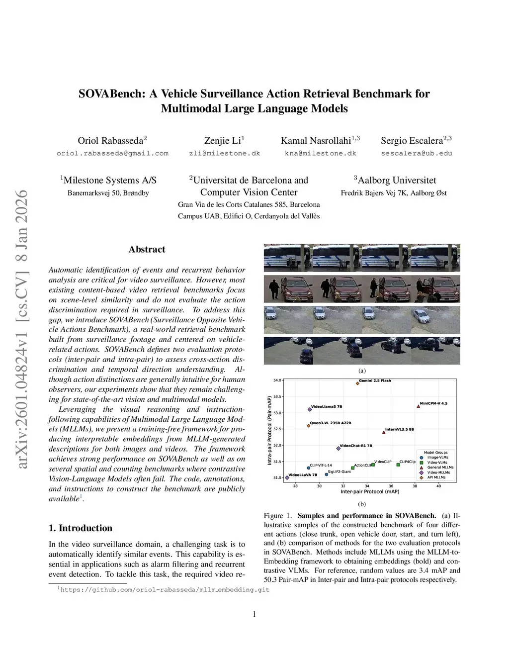 Automatic identification of events and recurrent behavior analysis are critical for video surveillance. However, most existing content-based video retrieval benchmarks focus on scene-level similarity and do not evaluate the action discrimination required in surveillance. To address this gap, we introduce SOVABench (Surveillance Opposite Vehicle Actions Benchmark), a real-world retrieval benchmark built from surveillance footage and centered on vehicle-related actions. SOVABench defines two evaluation protocols (inter-pair and intra-pair) to assess cross-action discrimination and temporal direction understanding. Although action distinctions are generally intuitive for human observers, our experiments show that they remain challenging for state-of-the-art vision and multimodal models.Leveraging the visual reasoning and instruction-following capabilities of Multimodal Large Language Models (MLLMs), we present a training-free framework for producing interpretable embeddings from MLLM-generated descriptions for both images and videos. The framework achieves strong performance on SOVABench as well as on several spatial and counting benchmarks where contrastive Vision-Language Models often fail. The code, annotations, and instructions to construct the benchmark are publicly available.