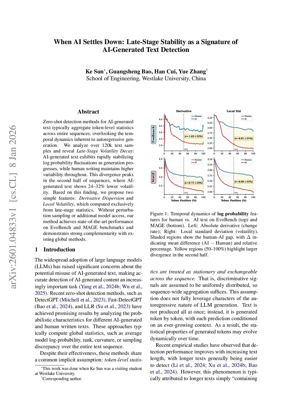 Zero-shot detection methods for AI-generated text typically aggregate token-level statistics across entire sequences, overlooking the temporal dynamics inherent to autoregressive generation. We analyze over 120k text samples and reveal Late-Stage Volatility Decay: AI-generated text exhibits rapidly stabilizing log probability fluctuations as generation progresses, while human writing maintains higher variability throughout. This divergence peaks in the second half of sequences, where AI-generated text shows 24--32\% lower volatility. Based on this finding, we propose two simple features: Derivative Dispersion and Local Volatility, which computed exclusively from late-stage statistics. Without perturbation sampling or additional model access, our method achieves state-of-the-art performance on EvoBench and MAGE benchmarks and demonstrates strong complementarity with existing global methods.