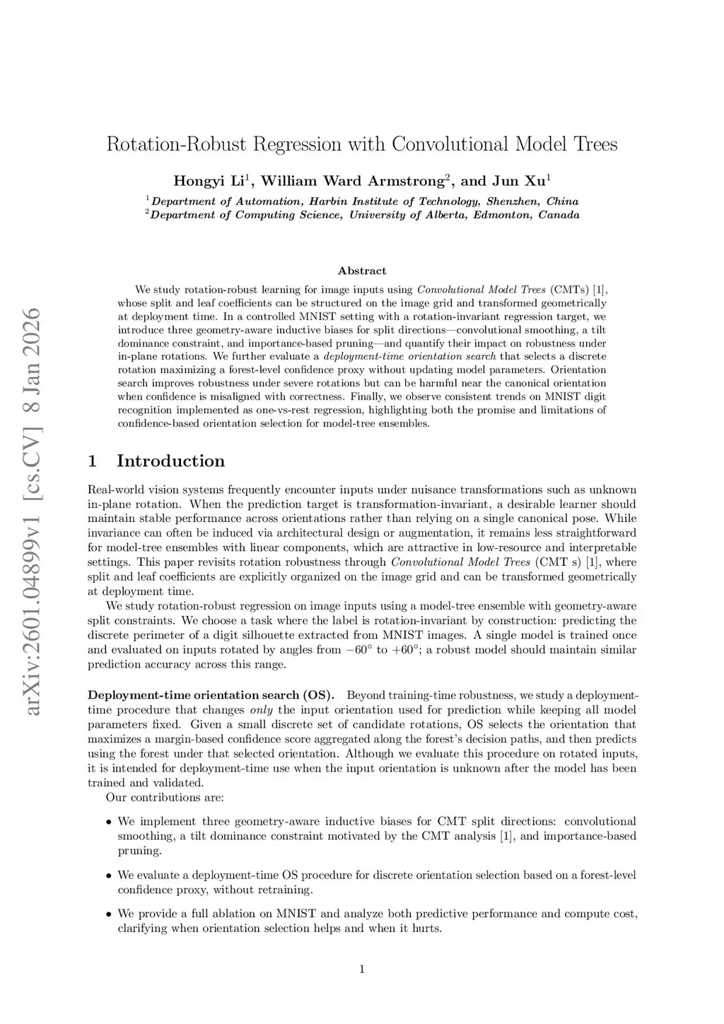 We study rotation-robust learning for image inputs using Convolutional Model Trees (CMTs) [1], whose split and leaf coefficients can be structured on the image grid and transformed geometrically at deployment time. In a controlled MNIST setting with a rotation-invariant regression target, we introduce three geometry-aware inductive biases for split directions -- convolutional smoothing, a tilt dominance constraint, and importance-based pruning -- and quantify their impact on robustness under in-plane rotations. We further evaluate a deployment-time orientation search that selects a discrete rotation maximizing a forest-level confidence proxy without updating model parameters. Orientation search improves robustness under severe rotations but can be harmful near the canonical orientation when confidence is misaligned with correctness. Finally, we observe consistent trends on MNIST digit recognition implemented as one-vs-rest regression, highlighting both the promise and limitations of confidence-based orientation selection for model-tree ensembles.
