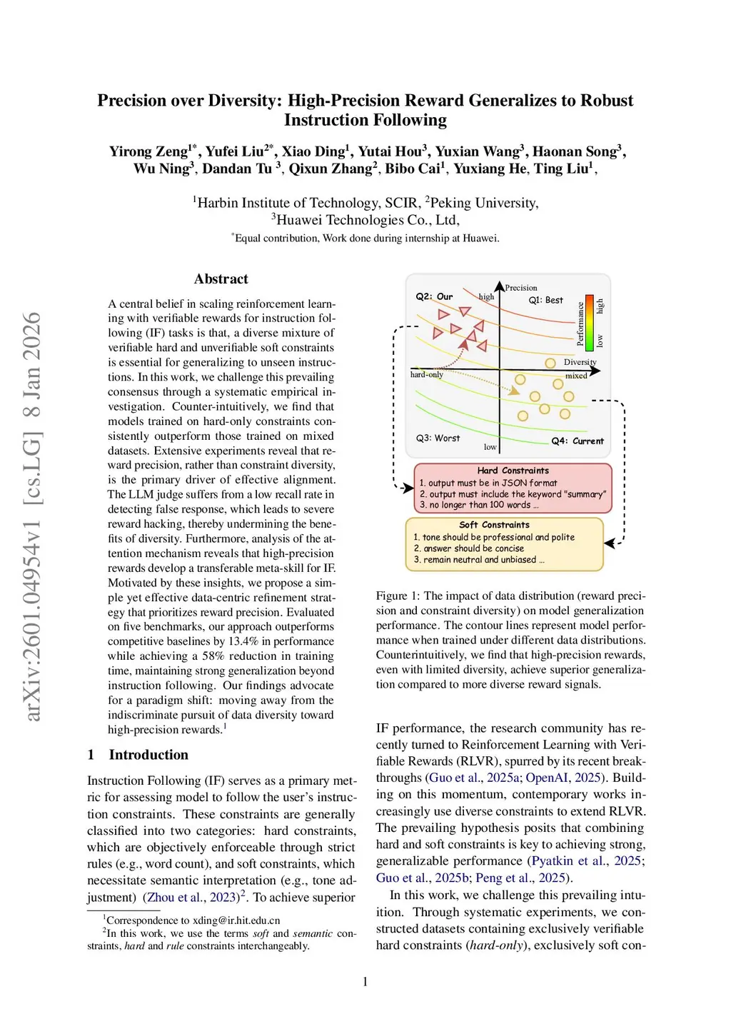 A central belief in scaling reinforcement learning with verifiable rewards for instruction following (IF) tasks is that, a diverse mixture of verifiable hard and unverifiable soft constraints is essential for generalizing to unseen instructions. In this work, we challenge this prevailing consensus through a systematic empirical investigation. Counter-intuitively, we find that models trained on hard-only constraints consistently outperform those trained on mixed datasets. Extensive experiments reveal that reward precision, rather than constraint diversity, is the primary driver of effective alignment. The LLM judge suffers from a low recall rate in detecting false response, which leads to severe reward hacking, thereby undermining the benefits of diversity. Furthermore, analysis of the attention mechanism reveals that high-precision rewards develop a transferable meta-skill for IF. Motivated by these insights, we propose a simple yet effective data-centric refinement strategy that prioritizes reward precision. Evaluated on five benchmarks, our approach outperforms competitive baselines by 13.4\% in performance while achieving a 58\% reduction in training time, maintaining strong generalization beyond instruction following. Our findings advocate for a paradigm shift: moving away from the indiscriminate pursuit of data diversity toward high-precision rewards.