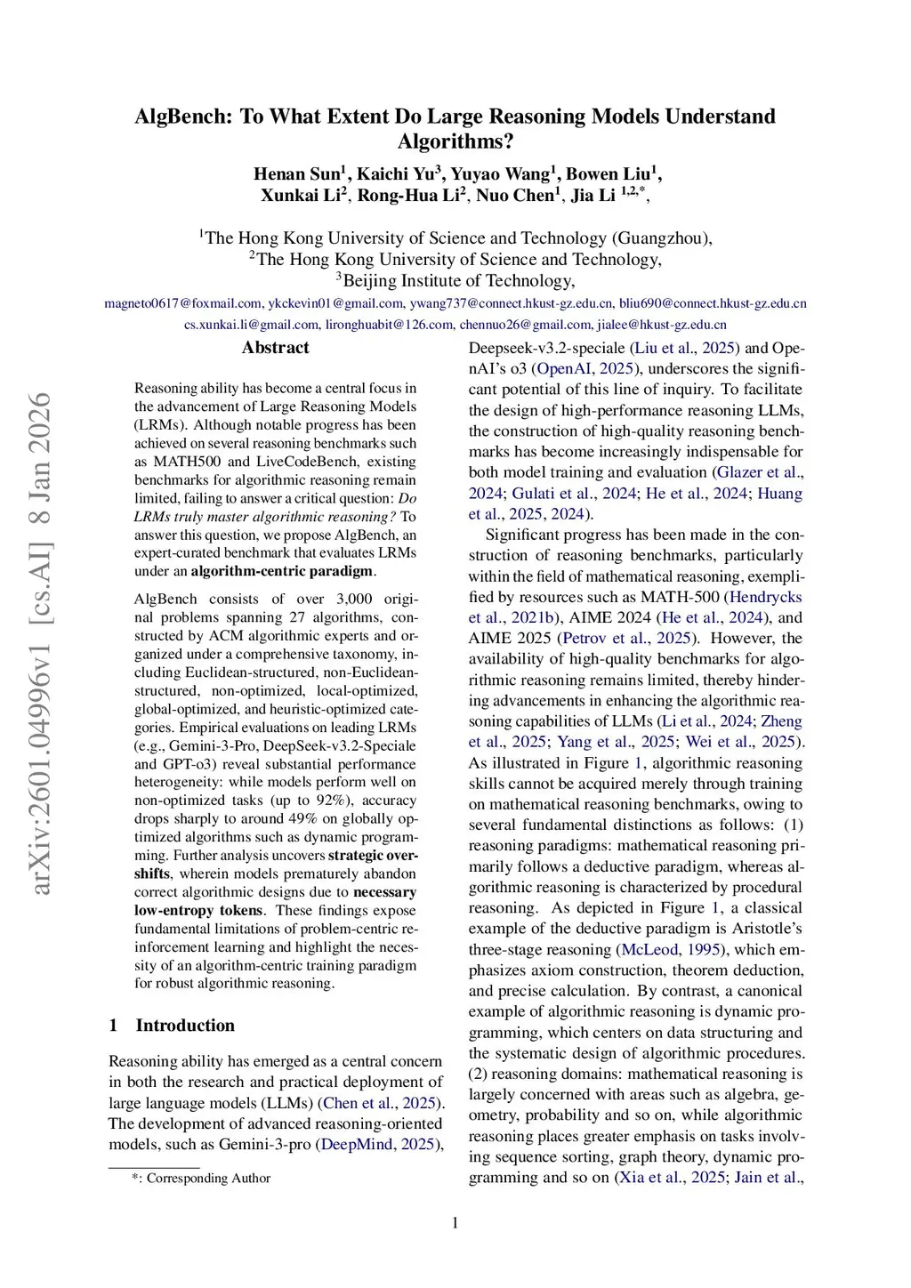 Reasoning ability has become a central focus in the advancement of Large Reasoning Models (LRMs). Although notable progress has been achieved on several reasoning benchmarks such as MATH500 and LiveCodeBench, existing benchmarks for algorithmic reasoning remain limited, failing to answer a critical question: Do LRMs truly master algorithmic reasoning? To answer this question, we propose AlgBench, an expert-curated benchmark that evaluates LRMs under an algorithm-centric paradigm. AlgBench consists of over 3,000 original problems spanning 27 algorithms, constructed by ACM algorithmic experts and organized under a comprehensive taxonomy, including Euclidean-structured, non-Euclidean-structured, non-optimized, local-optimized, global-optimized, and heuristic-optimized categories. Empirical evaluations on leading LRMs (e.g., Gemini-3-Pro, DeepSeek-v3.2-Speciale and GPT-o3) reveal substantial performance heterogeneity: while models perform well on non-optimized tasks (up to 92%), accuracy drops sharply to around 49% on globally optimized algorithms such as dynamic programming. Further analysis uncovers \textbf{strategic over-shifts}, wherein models prematurely abandon correct algorithmic designs due to necessary low-entropy tokens. These findings expose fundamental limitations of problem-centric reinforcement learning and highlight the necessity of an algorithm-centric training paradigm for robust algorithmic reasoning.