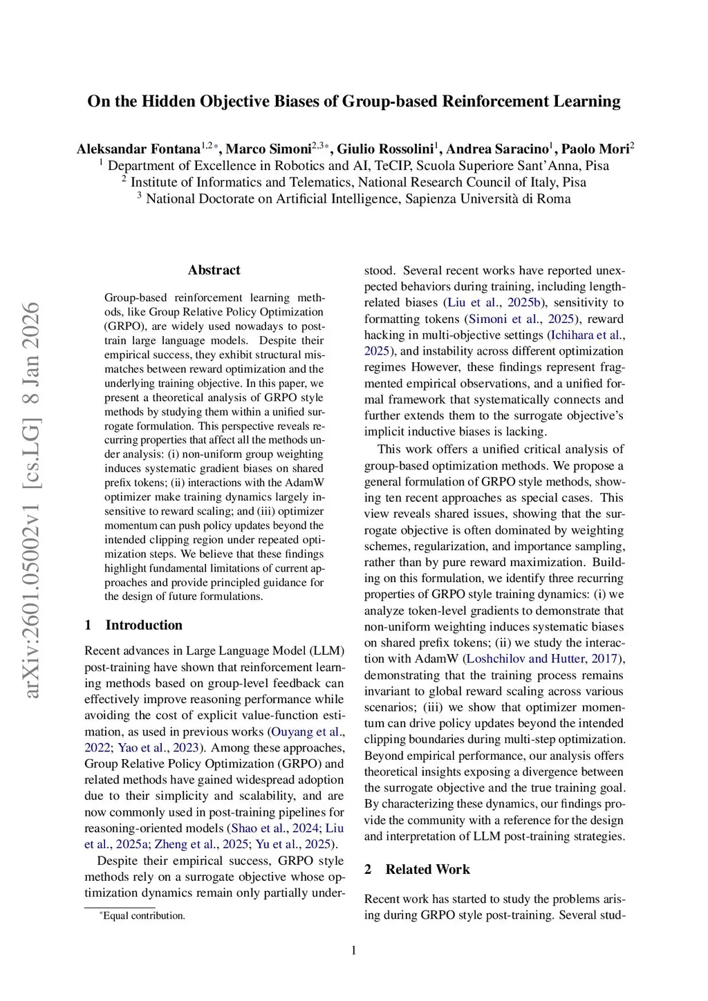 Group-based reinforcement learning methods, like Group Relative Policy Optimization (GRPO), are widely used nowadays to post-train large language models. Despite their empirical success, they exhibit structural mismatches between reward optimization and the underlying training objective. In this paper, we present a theoretical analysis of GRPO style methods by studying them within a unified surrogate formulation. This perspective reveals recurring properties that affect all the methods under analysis: (i) non-uniform group weighting induces systematic gradient biases on shared prefix tokens; (ii) interactions with the AdamW optimizer make training dynamics largely insensitive to reward scaling; and (iii) optimizer momentum can push policy updates beyond the intended clipping region under repeated optimization steps. We believe that these findings highlight fundamental limitations of current approaches and provide principled guidance for the design of future formulations.