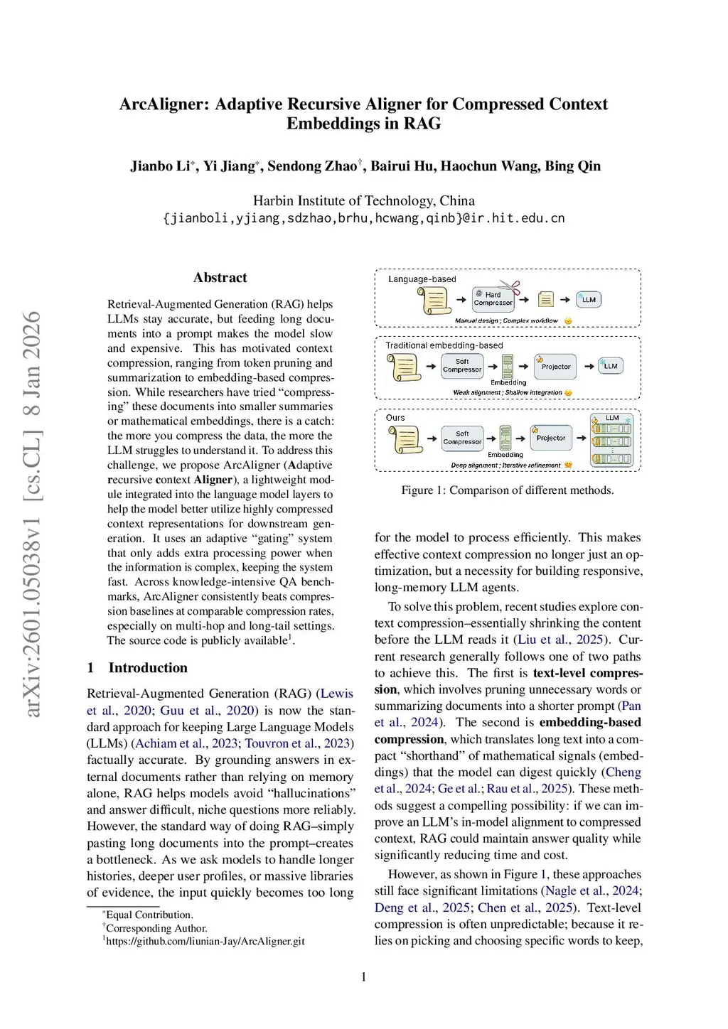 Retrieval-Augmented Generation (RAG) helps LLMs stay accurate, but feeding long documents into a prompt makes the model slow and expensive. This has motivated context compression, ranging from token pruning and summarization to embedding-based compression. While researchers have tried ''compressing'' these documents into smaller summaries or mathematical embeddings, there is a catch: the more you compress the data, the more the LLM struggles to understand it. To address this challenge, we propose ArcAligner (Adaptive recursive context *Aligner*), a lightweight module integrated into the language model layers to help the model better utilize highly compressed context representations for downstream generation. It uses an adaptive ''gating'' system that only adds extra processing power when the information is complex, keeping the system fast. Across knowledge-intensive QA benchmarks, ArcAligner consistently beats compression baselines at comparable compression rates, especially on multi-hop and long-tail settings. The source code is publicly available.