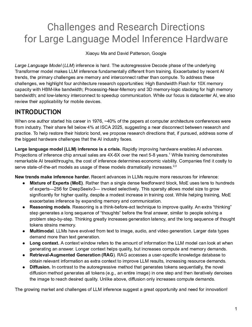 Large Language Model (LLM) inference is hard. The autoregressive Decode phase of the underlying Transformer model makes LLM inference fundamentally different from training. Exacerbated by recent AI trends, the primary challenges are memory and interconnect rather than compute. To address these challenges, we highlight four architecture research opportunities: High Bandwidth Flash for 10X memory capacity with HBM-like bandwidth; Processing-Near-Memory and 3D memory-logic stacking for high memory bandwidth; and low-latency interconnect to speedup communication. While our focus is datacenter AI, we also review their applicability for mobile devices.