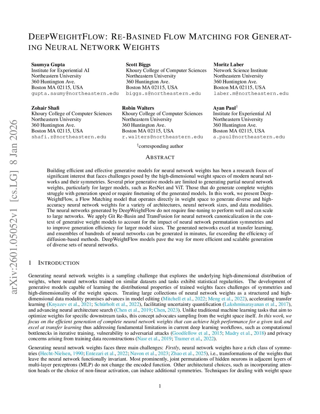 Building efficient and effective generative models for neural network weights has been a research focus of significant interest that faces challenges posed by the high-dimensional weight spaces of modern neural networks and their symmetries. Several prior generative models are limited to generating partial neural network weights, particularly for larger models, such as ResNet and ViT. Those that do generate complete weights struggle with generation speed or require finetuning of the generated models. In this work, we present DeepWeightFlow, a Flow Matching model that operates directly in weight space to generate diverse and high-accuracy neural network weights for a variety of architectures, neural network sizes, and data modalities. The neural networks generated by DeepWeightFlow do not require fine-tuning to perform well and can scale to large networks. We apply Git Re-Basin and TransFusion for neural network canonicalization in the context of generative weight models to account for the impact of neural network permutation symmetries and to improve generation efficiency for larger model sizes. The generated networks excel at transfer learning, and ensembles of hundreds of neural networks can be generated in minutes, far exceeding the efficiency of diffusion-based methods. DeepWeightFlow models pave the way for more efficient and scalable generation of diverse sets of neural networks.