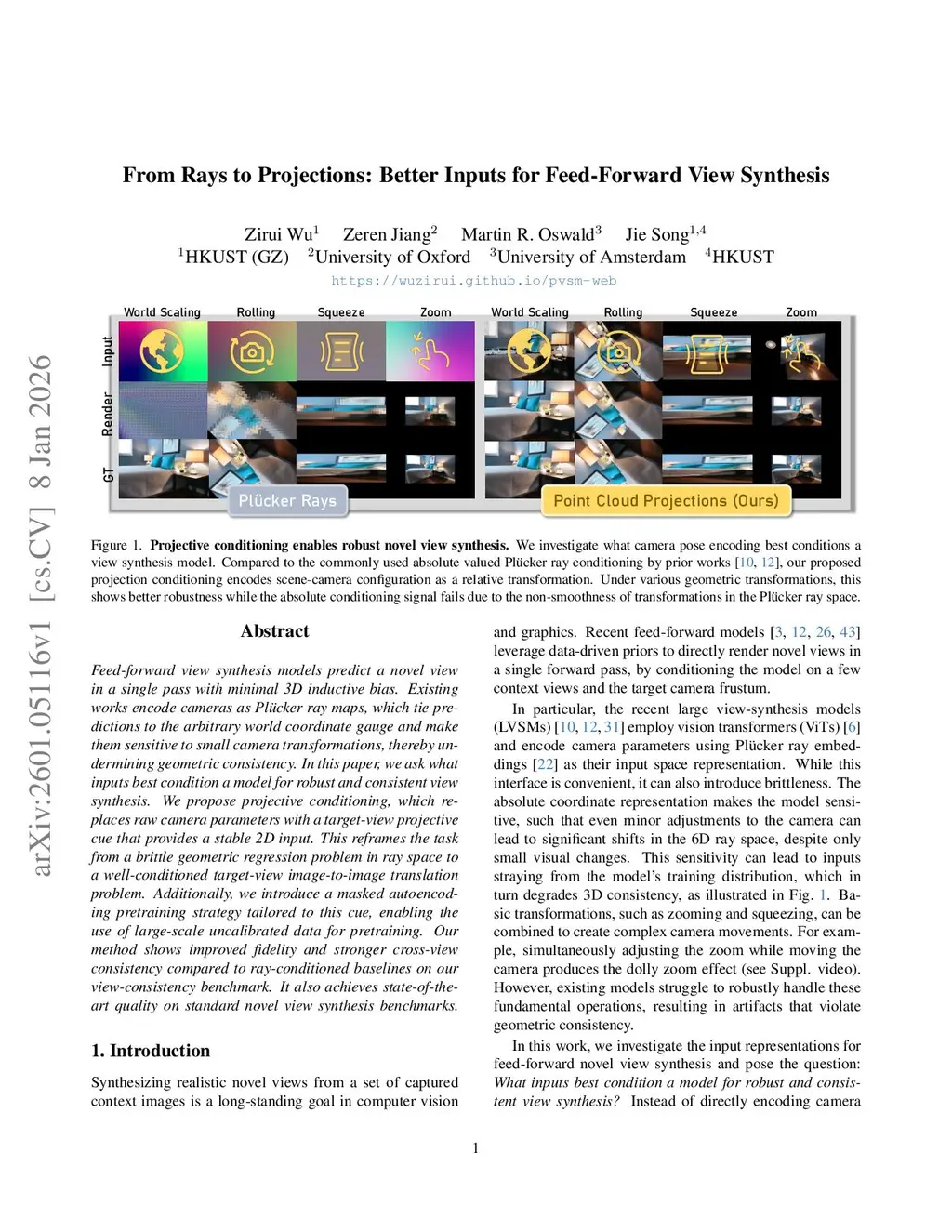 Feed-forward view synthesis models predict a novel view in a single pass with minimal 3D inductive bias. Existing works encode cameras as Plücker ray maps, which tie predictions to the arbitrary world coordinate gauge and make them sensitive to small camera transformations, thereby undermining geometric consistency. In this paper, we ask what inputs best condition a model for robust and consistent view synthesis. We propose projective conditioning, which replaces raw camera parameters with a target-view projective cue that provides a stable 2D input. This reframes the task from a brittle geometric regression problem in ray space to a well-conditioned target-view image-to-image translation problem. Additionally, we introduce a masked autoencoding pretraining strategy tailored to this cue, enabling the use of large-scale uncalibrated data for pretraining. Our method shows improved fidelity and stronger cross-view consistency compared to ray-conditioned baselines on our view-consistency benchmark. It also achieves state-of-the-art quality on standard novel view synthesis benchmarks.