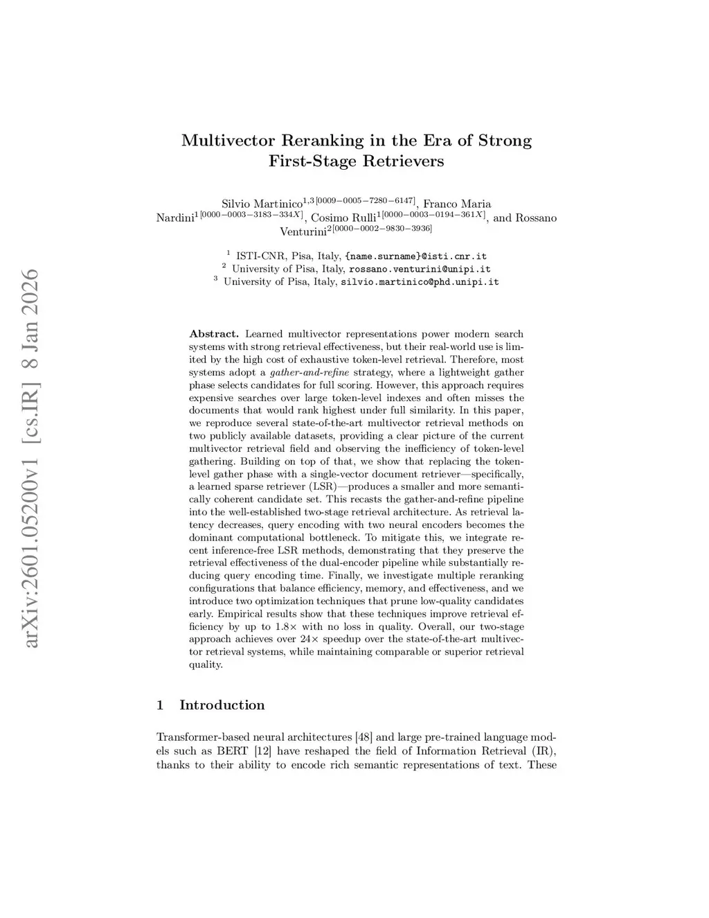 Learned multivector representations power modern search systems with strong retrieval effectiveness, but their real-world use is limited by the high cost of exhaustive token-level retrieval. Therefore, most systems adopt a \emph{gather-and-refine} strategy, where a lightweight gather phase selects candidates for full scoring. However, this approach requires expensive searches over large token-level indexes and often misses the documents that would rank highest under full similarity. In this paper, we reproduce several state-of-the-art multivector retrieval methods on two publicly available datasets, providing a clear picture of the current multivector retrieval field and observing the inefficiency of token-level gathering. Building on top of that, we show that replacing the token-level gather phase with a single-vector document retriever -- specifically, a learned sparse retriever (LSR) -- produces a smaller and more semantically coherent candidate set. This recasts the gather-and-refine pipeline into the well-established two-stage retrieval architecture. As retrieval latency decreases, query encoding with two neural encoders becomes the dominant computational bottleneck. To mitigate this, we integrate recent inference-free LSR methods, demonstrating that they preserve the retrieval effectiveness of the dual-encoder pipeline while substantially reducing query encoding time. Finally, we investigate multiple reranking configurations that balance efficiency, memory, and effectiveness, and we introduce two optimization techniques that prune low-quality candidates early. Empirical results show that these techniques improve retrieval efficiency by up to 1.8 with no loss in quality. Overall, our two-stage approach achieves over speedup over the state-of-the-art multivector retrieval systems, while maintaining comparable or superior retrieval quality.
