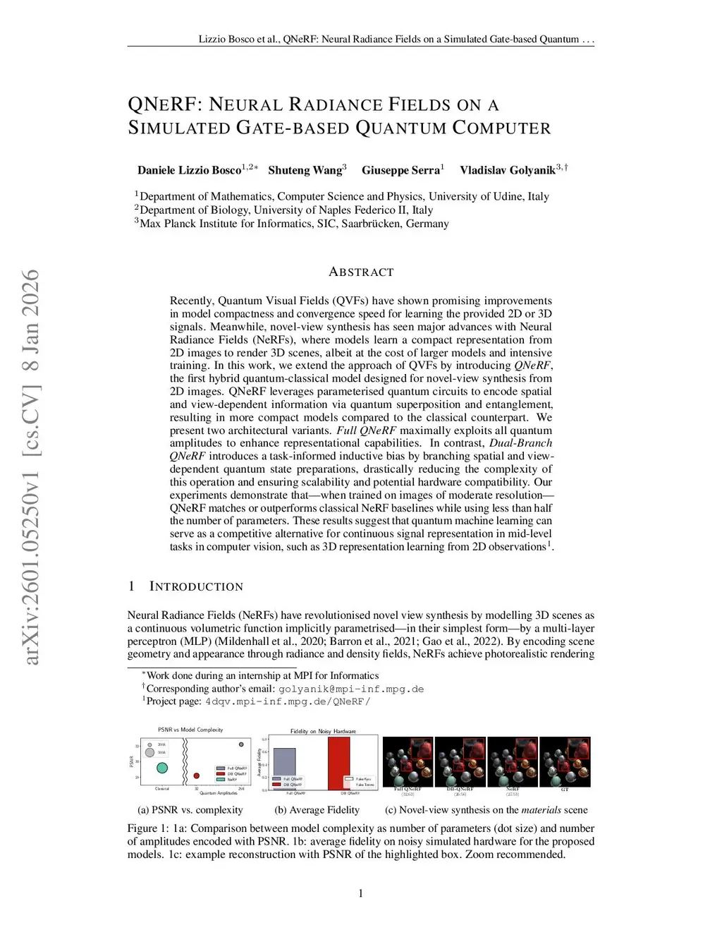 Recently, Quantum Visual Fields (QVFs) have shown promising improvements in model compactness and convergence speed for learning the provided 2D or 3D signals. Meanwhile, novel-view synthesis has seen major advances with Neural Radiance Fields (NeRFs), where models learn a compact representation from 2D images to render 3D scenes, albeit at the cost of larger models and intensive training. In this work, we extend the approach of QVFs by introducing QNeRF, the first hybrid quantum-classical model designed for novel-view synthesis from 2D images. QNeRF leverages parameterised quantum circuits to encode spatial and view-dependent information via quantum superposition and entanglement, resulting in more compact models compared to the classical counterpart. We present two architectural variants. Full QNeRF maximally exploits all quantum amplitudes to enhance representational capabilities. In contrast, Dual-Branch QNeRF introduces a task-informed inductive bias by branching spatial and view-dependent quantum state preparations, drastically reducing the complexity of this operation and ensuring scalability and potential hardware compatibility. Our experiments demonstrate that -- when trained on images of moderate resolution -- QNeRF matches or outperforms classical NeRF baselines while using less than half the number of parameters. These results suggest that quantum machine learning can serve as a competitive alternative for continuous signal representation in mid-level tasks in computer vision, such as 3D representation learning from 2D observations.