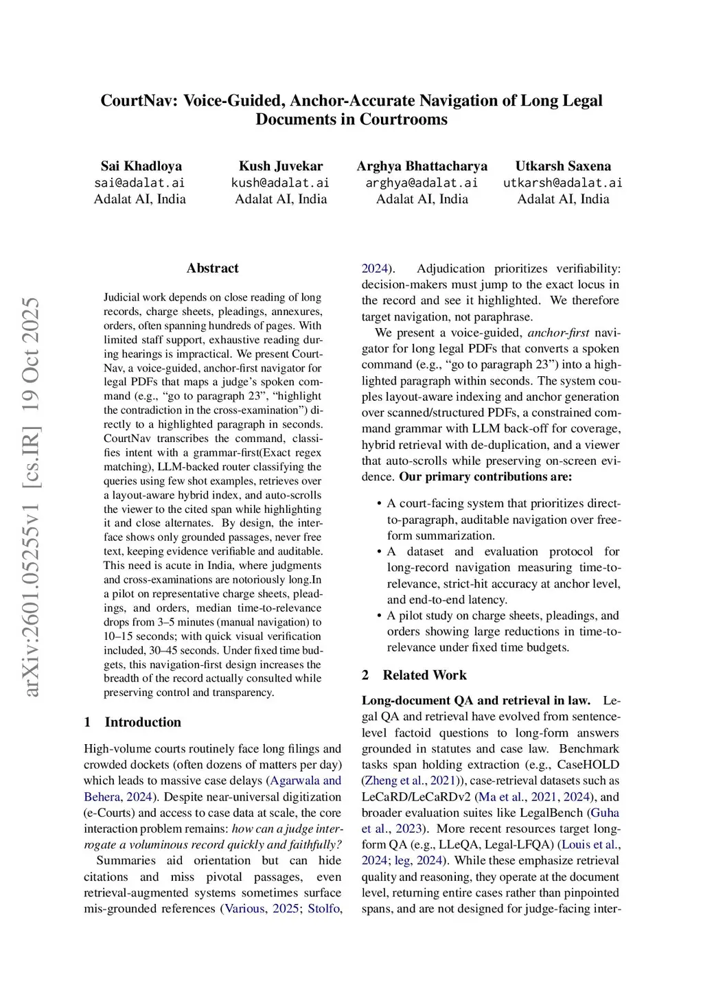 Judicial work depends on close reading of long records, charge sheets, pleadings, annexures, orders, often spanning hundreds of pages. With limited staff support, exhaustive reading during hearings is impractical. We present CourtNav, a voice-guided, anchor-first navigator for legal PDFs that maps a judge's spoken command (e.g., "go to paragraph 23", "highlight the contradiction in the cross-examination") directly to a highlighted paragraph in seconds. CourtNav transcribes the command, classifies intent with a grammar-first(Exact regex matching), LLM-backed router classifying the queries using few shot examples, retrieves over a layout-aware hybrid index, and auto-scrolls the viewer to the cited span while highlighting it and close alternates. By design, the interface shows only grounded passages, never free text, keeping evidence verifiable and auditable. This need is acute in India, where judgments and cross-examinations are notoriouslythis http URLa pilot on representative charge sheets, pleadings, and orders, median time-to-relevance drops from 3-5 minutes (manual navigation) to 10-15 seconds; with quick visual verification included, 30-45 seconds. Under fixed time budgets, this navigation-first design increases the breadth of the record actually consulted while preserving control and transparency.