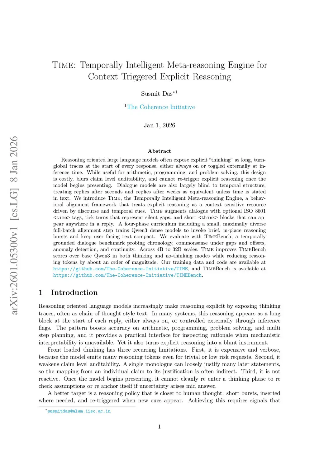 Reasoning oriented large language models often expose explicit "thinking" as long, turn-global traces at the start of every response, either always on or toggled externally at inference time. While useful for arithmetic, programming, and problem solving, this design is costly, blurs claim level auditability, and cannot re-trigger explicit reasoning once the model begins presenting. Dialogue models are also largely blind to temporal structure, treating replies after seconds and replies after weeks as equivalent unless time is stated in text. We introduce TIME, the Temporally Intelligent Meta-reasoning Engine, a behavioral alignment framework that treats explicit reasoning as a context sensitive resource driven by discourse and temporal cues. TIME augments dialogue with optional ISO 8601 <time> tags, tick turns that represent silent gaps, and short <think> blocks that can appear anywhere in a reply. A four-phase curriculum including a small, maximally diverse full-batch alignment step trains Qwen3 dense models to invoke brief, in-place reasoning bursts and keep user facing text compact. We evaluate with TIMEBench, a temporally grounded dialogue benchmark probing chronology, commonsense under gaps and offsets, anomaly detection, and continuity. Across 4B to 32B scales, TIME improves TIMEBench scores over base Qwen3 in both thinking and no-thinking modes while reducing reasoning tokens by about an order of magnitude. Our training data and code are available atthis https URLand TIMEBench is available atthis https URL