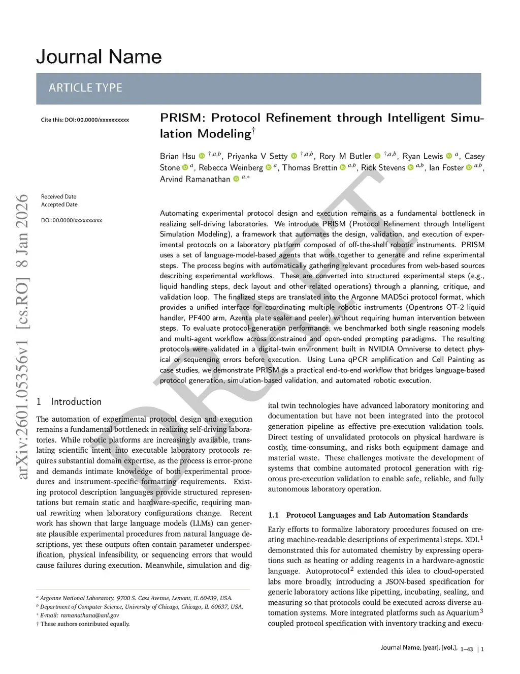 Automating experimental protocol design and execution remains as a fundamental bottleneck in realizing self-driving laboratories. We introduce PRISM (Protocol Refinement through Intelligent Simulation Modeling), a framework that automates the design, validation, and execution of experimental protocols on a laboratory platform composed of off-the-shelf robotic instruments. PRISM uses a set of language-model-based agents that work together to generate and refine experimental steps. The process begins with automatically gathering relevant procedures from web-based sources describing experimental workflows. These are converted into structured experimental steps (e.g., liquid handling steps, deck layout and other related operations) through a planning, critique, and validation loop. The finalized steps are translated into the Argonne MADSci protocol format, which provides a unified interface for coordinating multiple robotic instruments (Opentrons OT-2 liquid handler, PF400 arm, Azenta plate sealer and peeler) without requiring human intervention between steps. To evaluate protocol-generation performance, we benchmarked both single reasoning models and multi-agent workflow across constrained and open-ended prompting paradigms. The resulting protocols were validated in a digital-twin environment built in NVIDIA Omniverse to detect physical or sequencing errors before execution. Using Luna qPCR amplification and Cell Painting as case studies, we demonstrate PRISM as a practical end-to-end workflow that bridges language-based protocol generation, simulation-based validation, and automated robotic execution.
