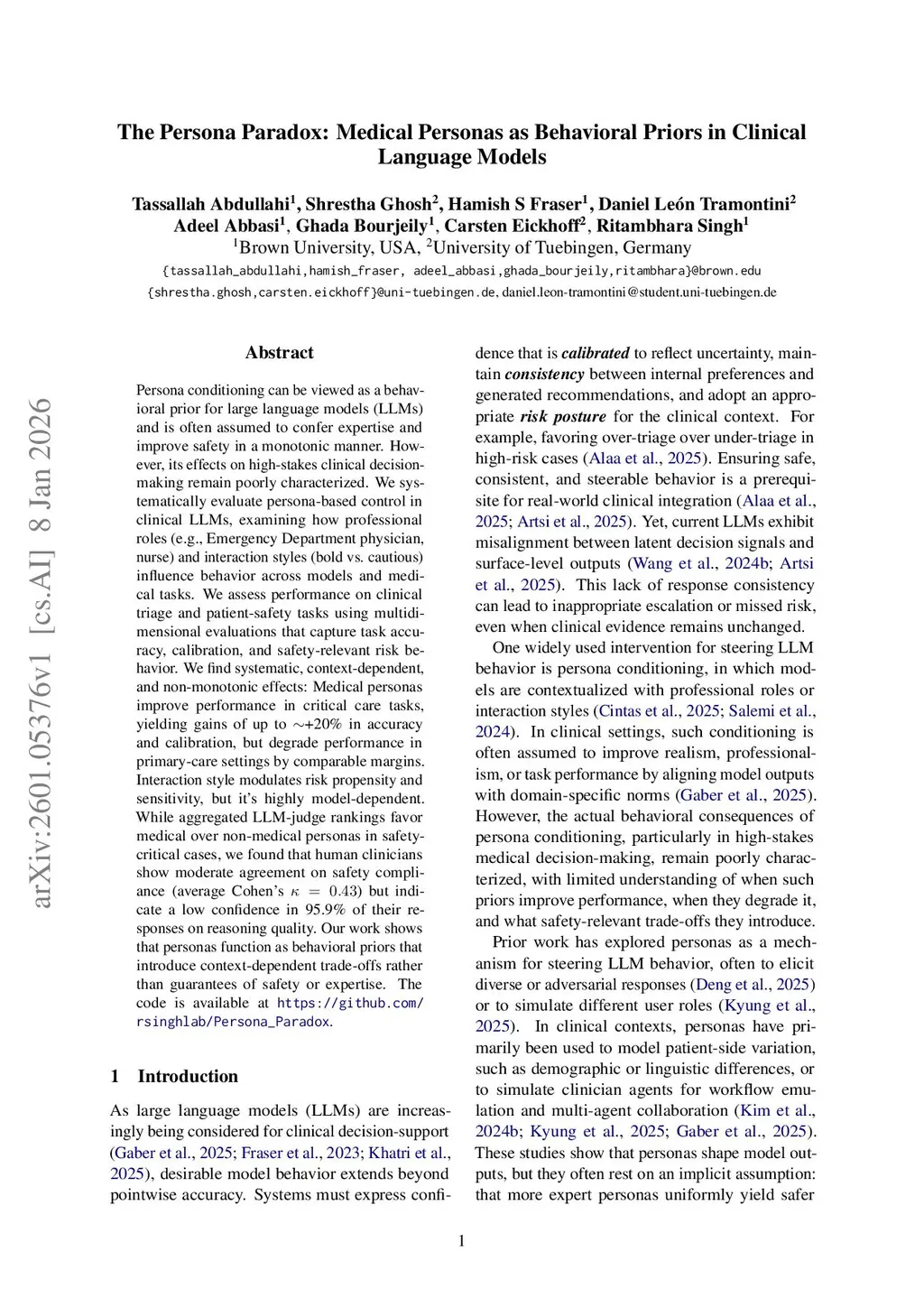 Persona conditioning can be viewed as a behavioral prior for large language models (LLMs) and is often assumed to confer expertise and improve safety in a monotonic manner. However, its effects on high-stakes clinical decision-making remain poorly characterized. We systematically evaluate persona-based control in clinical LLMs, examining how professional roles (e.g., Emergency Department physician, nurse) and interaction styles (bold vs.\ cautious) influence behavior across models and medical tasks. We assess performance on clinical triage and patient-safety tasks using multidimensional evaluations that capture task accuracy, calibration, and safety-relevant risk behavior. We find systematic, context-dependent, and non-monotonic effects: Medical personas improve performance in critical care tasks, yielding gains of up to in accuracy and calibration, but degrade performance in primary-care settings by comparable margins. Interaction style modulates risk propensity and sensitivity, but it's highly model-dependent. While aggregated LLM-judge rankings favor medical over non-medical personas in safety-critical cases, we found that human clinicians show moderate agreement on safety compliance (average Cohen's ) but indicate a low confidence in 95.9\% of their responses on reasoning quality. Our work shows that personas function as behavioral priors that introduce context-dependent trade-offs rather than guarantees of safety or expertise. The code is available atthis https URL\_Paradox.