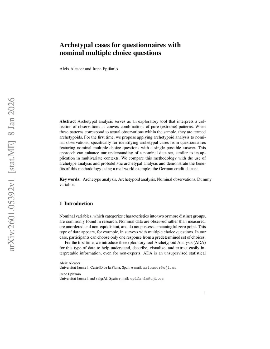 Archetypal analysis serves as an exploratory tool that interprets a collection of observations as convex combinations of pure (extreme) patterns. When these patterns correspond to actual observations within the sample, they are termed archetypoids. For the first time, we propose applying archetypoid analysis to nominal observations, specifically for identifying archetypal cases from questionnaires featuring nominal multiple-choice questions with a single possible answer. This approach can enhance our understanding of a nominal data set, similar to its application in multivariate contexts. We compare this methodology with the use of archetype analysis and probabilistic archetypal analysis and demonstrate the benefits of this methodology using a real-world example: the German credit dataset.