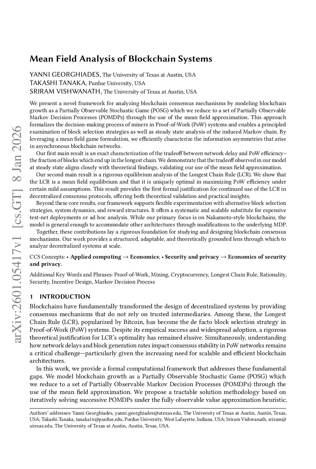 We present a novel framework for analyzing blockchain consensus mechanisms by modeling blockchain growth as a Partially Observable Stochastic Game (POSG) which we reduce to a set of Partially Observable Markov Decision Processes (POMDPs) through the use of the mean field approximation. This approach formalizes the decision-making process of miners in Proof-of-Work (PoW) systems and enables a principled examination of block selection strategies as well as steady state analysis of the induced Markov chain. By leveraging a mean field game formulation, we efficiently characterize the information asymmetries that arise in asynchronous blockchain networks.Our first main result is an exact characterization of the tradeoff between network delay and PoW efficiency--the fraction of blocks which end up in the longest chain. We demonstrate that the tradeoff observed in our model at steady state aligns closely with theoretical findings, validating our use of the mean field approximation.Our second main result is a rigorous equilibrium analysis of the Longest Chain Rule (LCR). We show that the LCR is a mean field equilibrium and that it is uniquely optimal in maximizing PoW efficiency under certain mild assumptions. This result provides the first formal justification for continued use of the LCR in decentralized consensus protocols, offering both theoretical validation and practical insights.Beyond these core results, our framework supports flexible experimentation with alternative block selection strategies, system dynamics, and reward structures. It offers a systematic and scalable substitute for expensive test-net deployments or ad hoc analysis. While our primary focus is on Nakamoto-style blockchains, the model is general enough to accommodate other architectures through modifications to the underlying MDP.