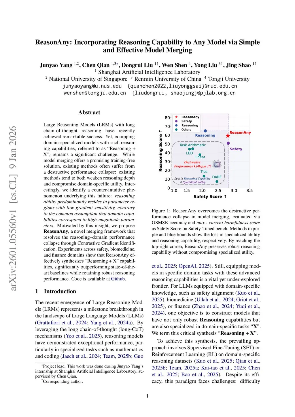 Large Reasoning Models (LRMs) with long chain-of-thought reasoning have recently achieved remarkable success. Yet, equipping domain-specialized models with such reasoning capabilities, referred to as "Reasoning + X", remains a significant challenge. While model merging offers a promising training-free solution, existing methods often suffer from a destructive performance collapse: existing methods tend to both weaken reasoning depth and compromise domain-specific utility. Interestingly, we identify a counter-intuitive phenomenon underlying this failure: reasoning ability predominantly resides in parameter regions with low gradient sensitivity, contrary to the common assumption that domain capabilities correspond to high-magnitude parameters. Motivated by this insight, we propose ReasonAny, a novel merging framework that resolves the reasoning-domain performance collapse through Contrastive Gradient Identification. Experiments across safety, biomedicine, and finance domains show that ReasonAny effectively synthesizes "Reasoning + X" capabilities, significantly outperforming state-of-the-art baselines while retaining robust reasoning performance.
