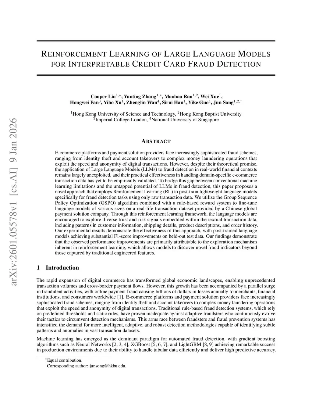 E-commerce platforms and payment solution providers face increasingly sophisticated fraud schemes, ranging from identity theft and account takeovers to complex money laundering operations that exploit the speed and anonymity of digital transactions. However, despite their theoretical promise, the application of Large Language Models (LLMs) to fraud detection in real-world financial contexts remains largely unexploited, and their practical effectiveness in handling domain-specific e-commerce transaction data has yet to be empirically validated. To bridge this gap between conventional machine learning limitations and the untapped potential of LLMs in fraud detection, this paper proposes a novel approach that employs Reinforcement Learning (RL) to post-train lightweight language models specifically for fraud detection tasks using only raw transaction data. We utilize the Group Sequence Policy Optimization (GSPO) algorithm combined with a rule-based reward system to fine-tune language models of various sizes on a real-life transaction dataset provided by a Chinese global payment solution company. Through this reinforcement learning framework, the language models are encouraged to explore diverse trust and risk signals embedded within the textual transaction data, including patterns in customer information, shipping details, product descriptions, and order history. Our experimental results demonstrate the effectiveness of this approach, with post-trained language models achieving substantial F1-score improvements on held-out test data. Our findings demonstrate that the observed performance improvements are primarily attributable to the exploration mechanism inherent in reinforcement learning, which allows models to discover novel fraud indicators beyond those captured by traditional engineered features.