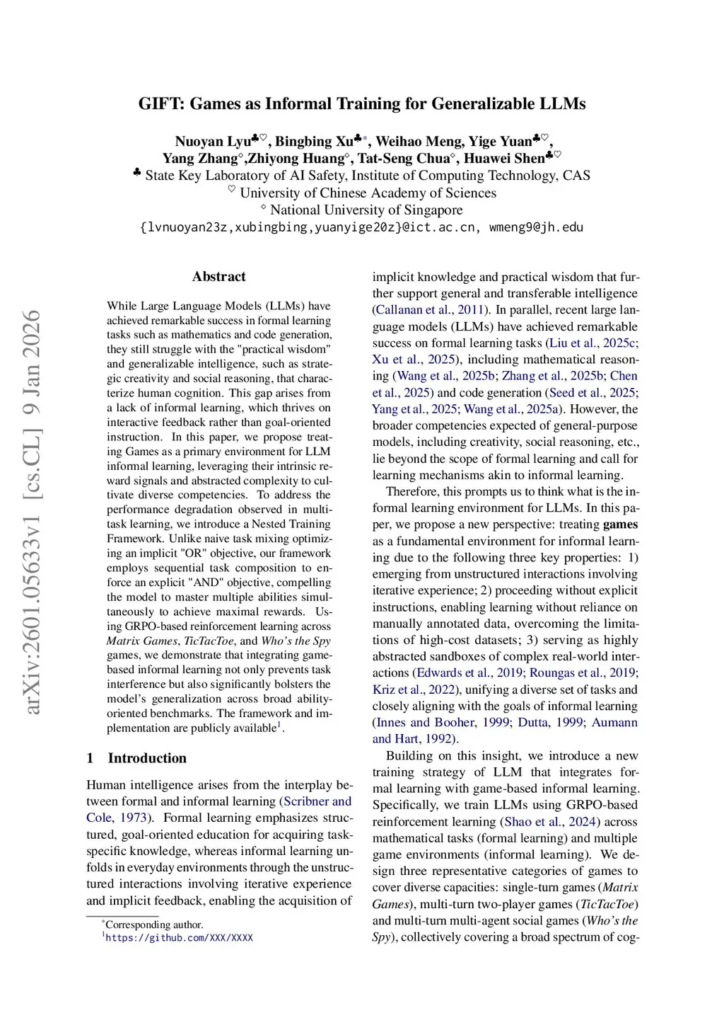 While Large Language Models (LLMs) have achieved remarkable success in formal learning tasks such as mathematics and code generation, they still struggle with the "practical wisdom" and generalizable intelligence, such as strategic creativity and social reasoning, that characterize human cognition. This gap arises from a lack of informal learning, which thrives on interactive feedback rather than goal-oriented instruction. In this paper, we propose treating Games as a primary environment for LLM informal learning, leveraging their intrinsic reward signals and abstracted complexity to cultivate diverse competencies. To address the performance degradation observed in multi-task learning, we introduce a Nested Training Framework. Unlike naive task mixing optimizing an implicit "OR" objective, our framework employs sequential task composition to enforce an explicit "AND" objective, compelling the model to master multiple abilities simultaneously to achieve maximal rewards. Using GRPO-based reinforcement learning across Matrix Games, TicTacToe, and Who's the Spy games, we demonstrate that integrating game-based informal learning not only prevents task interference but also significantly bolsters the model's generalization across broad ability-oriented benchmarks. The framework and implementation are publicly available.