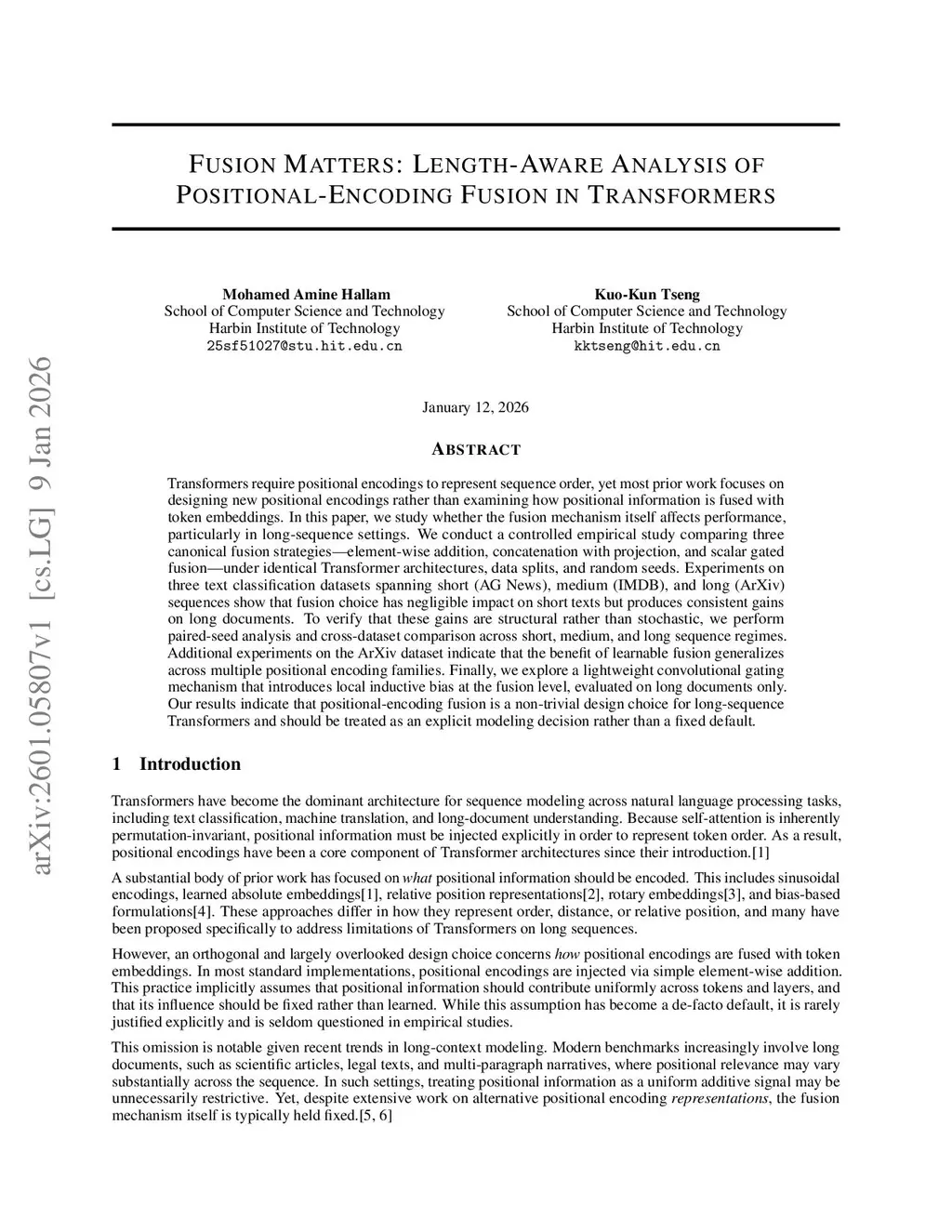 Transformers require positional encodings to represent sequence order, yet most prior work focuses on designing new positional encodings rather than examining how positional information is fused with token embeddings. In this paper, we study whether the fusion mechanism itself affects performance, particularly in long-sequence settings. We conduct a controlled empirical study comparing three canonical fusion strategies--element-wise addition, concatenation with projection, and scalar gated fusion--under identical Transformer architectures, data splits, and random seeds. Experiments on three text classification datasets spanning short (AG News), medium (IMDB), and long (ArXiv) sequences show that fusion choice has negligible impact on short texts but produces consistent gains on long documents. To verify that these gains are structural rather than stochastic, we perform paired-seed analysis and cross-dataset comparison across sequence-length regimes. Additional experiments on the ArXiv dataset indicate that the benefit of learnable fusion generalizes across multiple positional encoding families. Finally, we explore a lightweight convolutional gating mechanism that introduces local inductive bias at the fusion level, evaluated on long documents only. Our results indicate that positional-encoding fusion is a non-trivial design choice for long-sequence Transformers and should be treated as an explicit modeling decision rather than a fixed default.