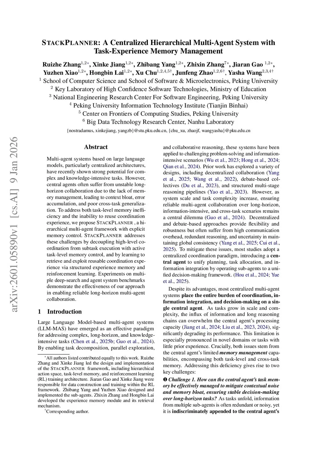 StackPlanner: A Centralized Hierarchical Multi-Agent System with Task-Experience Memory Management