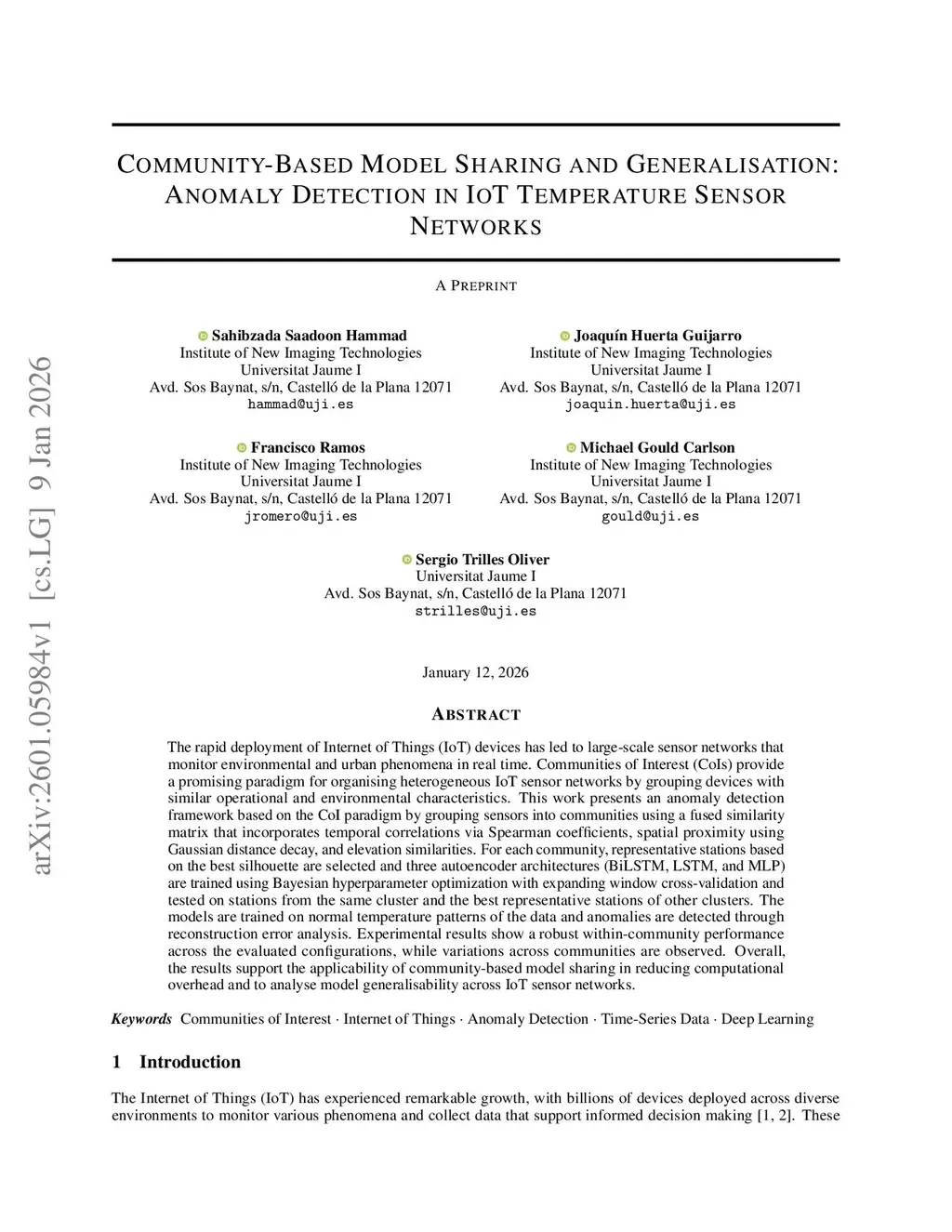 The rapid deployment of Internet of Things (IoT) devices has led to large-scale sensor networks that monitor environmental and urban phenomena in real time. Communities of Interest (CoIs) provide a promising paradigm for organising heterogeneous IoT sensor networks by grouping devices with similar operational and environmental characteristics. This work presents an anomaly detection framework based on the CoI paradigm by grouping sensors into communities using a fused similarity matrix that incorporates temporal correlations via Spearman coefficients, spatial proximity using Gaussian distance decay, and elevation similarities. For each community, representative stations based on the best silhouette are selected and three autoencoder architectures (BiLSTM, LSTM, and MLP) are trained using Bayesian hyperparameter optimization with expanding window cross-validation and tested on stations from the same cluster and the best representative stations of other clusters. The models are trained on normal temperature patterns of the data and anomalies are detected through reconstruction error analysis. Experimental results show a robust within-community performance across the evaluated configurations, while variations across communities are observed. Overall, the results support the applicability of community-based model sharing in reducing computational overhead and to analyse model generalisability across IoT sensor networks.