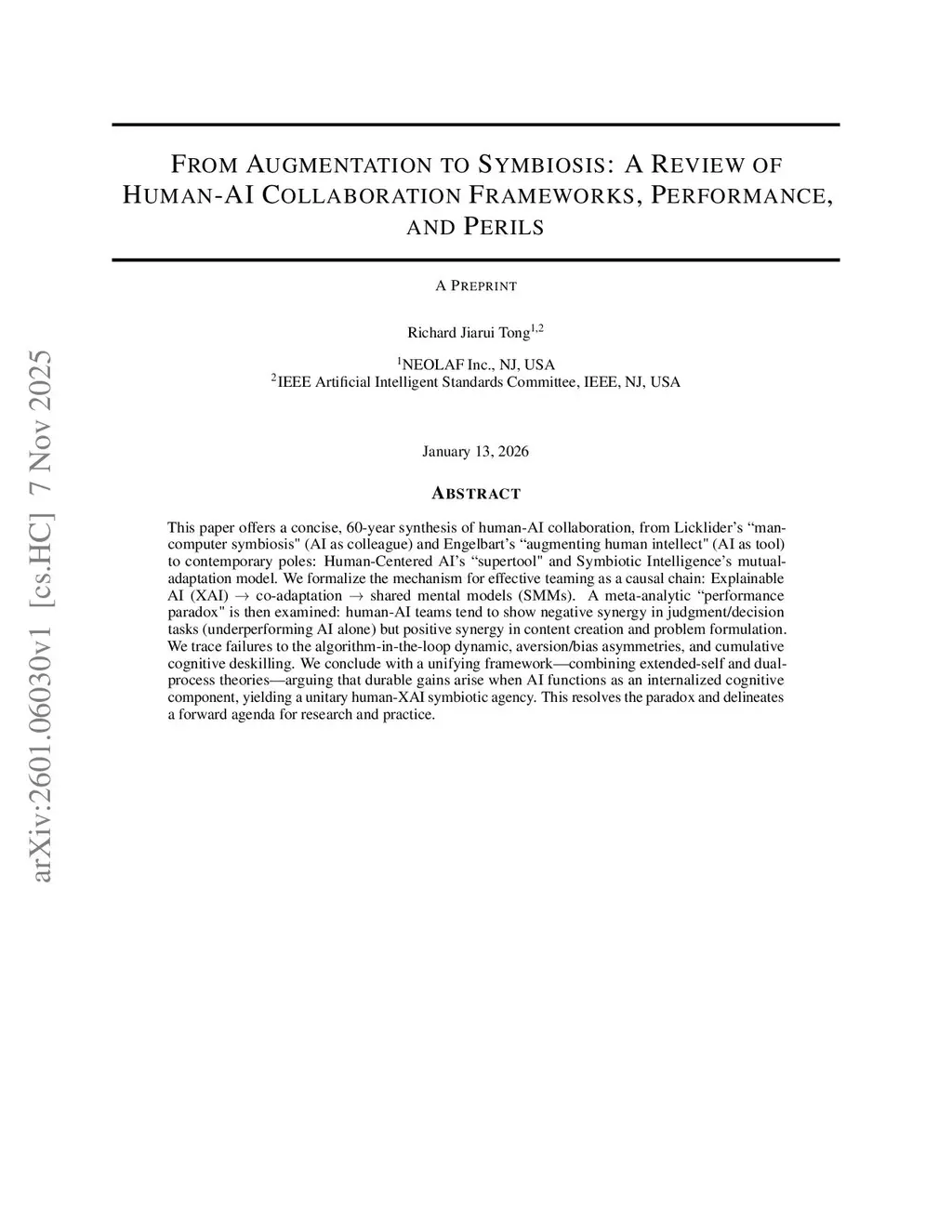This paper offers a concise, 60-year synthesis of human-AI collaboration, from Licklider's ``man-computer symbiosis" (AI as colleague) and Engelbart's ``augmenting human intellect" (AI as tool) to contemporary poles: Human-Centered AI's ``supertool" and Symbiotic Intelligence's mutual-adaptation model. We formalize the mechanism for effective teaming as a causal chain: Explainable AI (XAI) -> co-adaptation -> shared mental models (SMMs). A meta-analytic ``performance paradox" is then examined: human-AI teams tend to show negative synergy in judgment/decision tasks (underperforming AI alone) but positive synergy in content creation and problem formulation. We trace failures to the algorithm-in-the-loop dynamic, aversion/bias asymmetries, and cumulative cognitive deskilling. We conclude with a unifying framework--combining extended-self and dual-process theories--arguing that durable gains arise when AI functions as an internalized cognitive component, yielding a unitary human-XAI symbiotic agency. This resolves the paradox and delineates a forward agenda for research and practice.