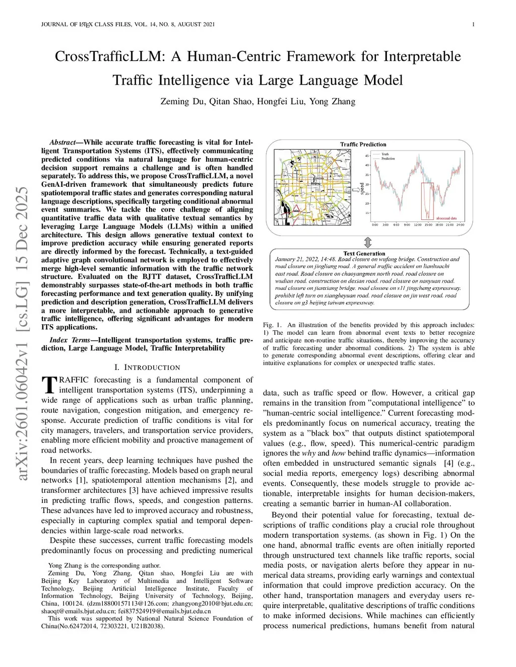 While accurate traffic forecasting is vital for Intelligent Transportation Systems (ITS), effectively communicating predicted conditions via natural language for human-centric decision support remains a challenge and is often handled separately. To address this, we propose CrossTrafficLLM, a novel GenAI-driven framework that simultaneously predicts future spatiotemporal traffic states and generates corresponding natural language descriptions, specifically targeting conditional abnormal event summaries. We tackle the core challenge of aligning quantitative traffic data with qualitative textual semantics by leveraging Large Language Models (LLMs) within a unified architecture. This design allows generative textual context to improve prediction accuracy while ensuring generated reports are directly informed by the forecast. Technically, a text-guided adaptive graph convolutional network is employed to effectively merge high-level semantic information with the traffic network structure. Evaluated on the BJTT dataset, CrossTrafficLLM demonstrably surpasses state-of-the-art methods in both traffic forecasting performance and text generation quality. By unifying prediction and description generation, CrossTrafficLLM delivers a more interpretable, and actionable approach to generative traffic intelligence, offering significant advantages for modern ITS applications.