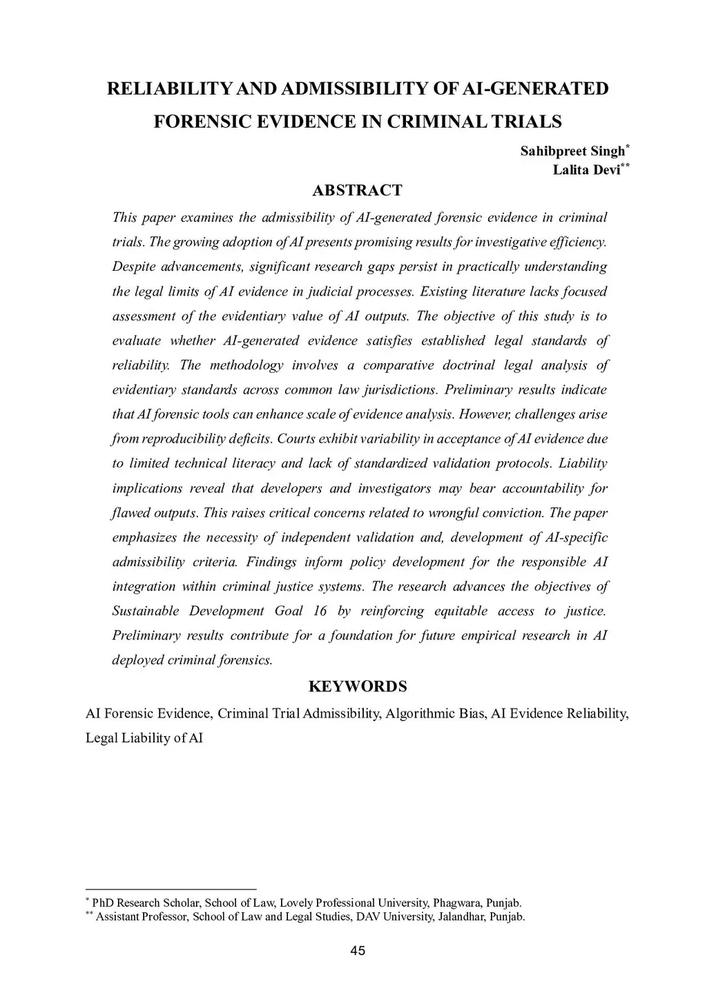 This paper examines the admissibility of AI-generated forensic evidence in criminal trials. The growing adoption of AI presents promising results for investigative efficiency. Despite advancements, significant research gaps persist in practically understanding the legal limits of AI evidence in judicial processes. Existing literature lacks focused assessment of the evidentiary value of AI outputs. The objective of this study is to evaluate whether AI-generated evidence satisfies established legal standards of reliability. The methodology involves a comparative doctrinal legal analysis of evidentiary standards across common law jurisdictions. Preliminary results indicate that AI forensic tools can enhance scale of evidence analysis. However, challenges arise from reproducibility deficits. Courts exhibit variability in acceptance of AI evidence due to limited technical literacy and lack of standardized validation protocols. Liability implications reveal that developers and investigators may bear accountability for flawed outputs. This raises critical concerns related to wrongful conviction. The paper emphasizes the necessity of independent validation and, development of AI-specific admissibility criteria. Findings inform policy development for the responsible AI integration within criminal justice systems. The research advances the objectives of Sustainable Development Goal 16 by reinforcing equitable access to justice. Preliminary results contribute for a foundation for future empirical research in AI deployed criminal forensics.