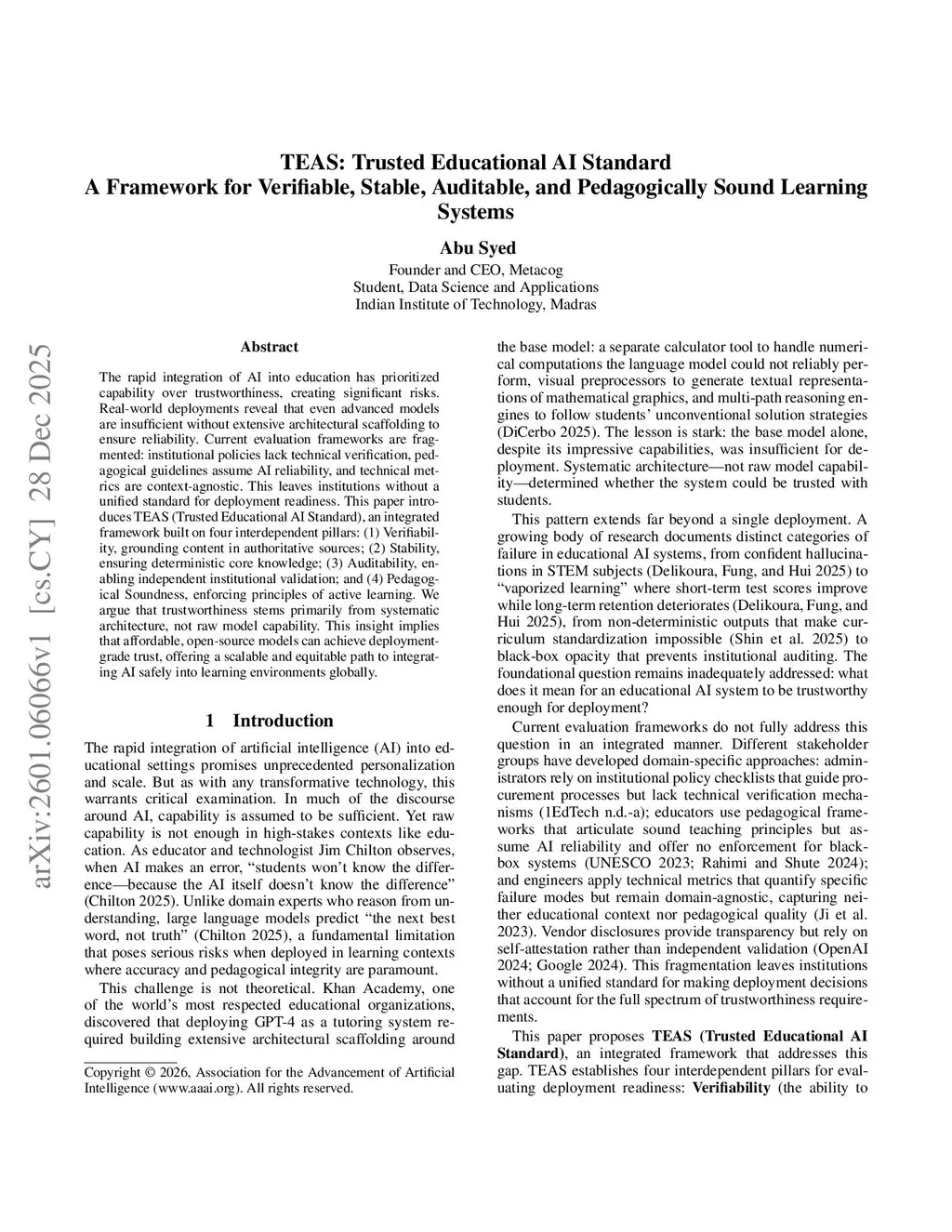 TEAS: Trusted Educational AI Standard: A Framework for Verifiable, Stable, Auditable, and Pedagogically Sound Learning Systems