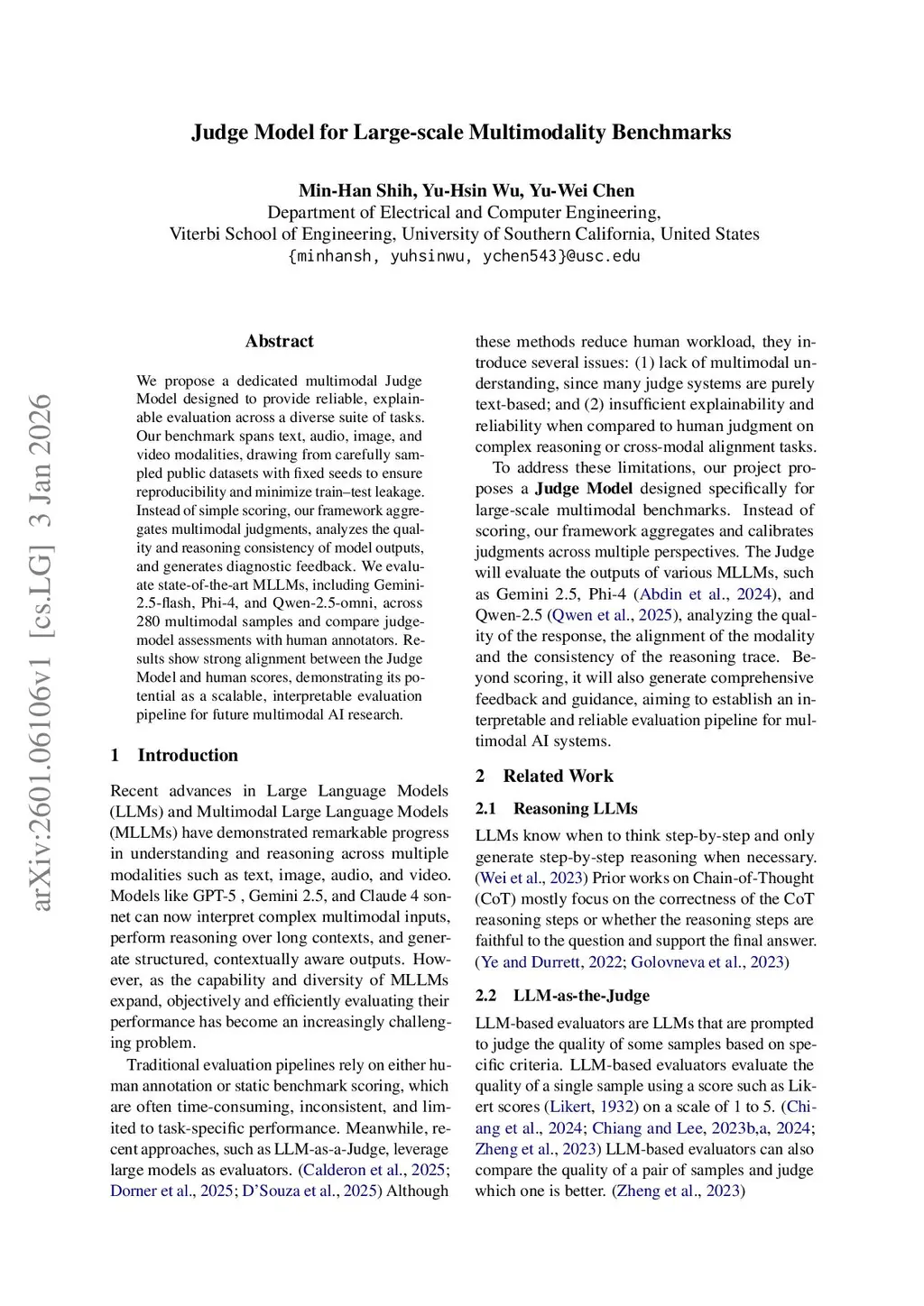 We propose a dedicated multimodal Judge Model designed to provide reliable, explainable evaluation across a diverse suite of tasks. Our benchmark spans text, audio, image, and video modalities, drawing from carefully sampled public datasets with fixed seeds to ensure reproducibility and minimize train test leakage. Instead of simple scoring, our framework aggregates multimodal judgments, analyzes the quality and reasoning consistency of model outputs, and generates diagnostic feedback. We evaluate several MLLMs, including Gemini 2.5, Phi 4, and Qwen 2.5, across 280 multimodal samples and compare judge model assessments with human annotators. Results show strong alignment between the Judge Model and human scores, demonstrating its potential as a scalable, interpretable evaluation pipeline for future multimodal AI research.