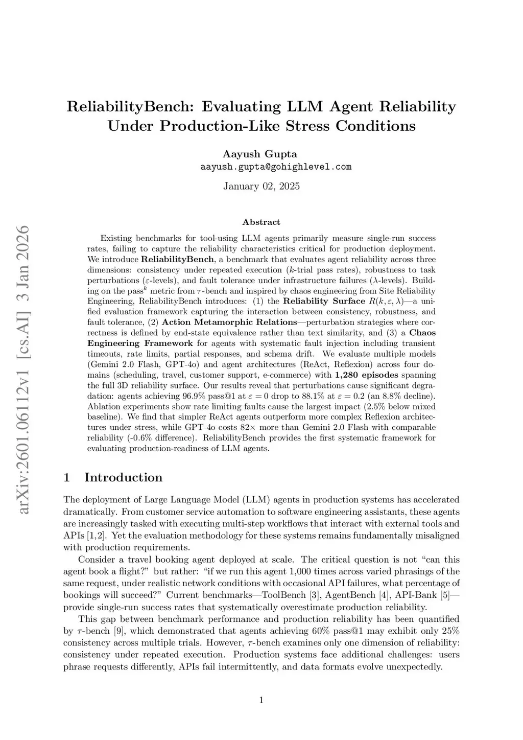 Existing benchmarks for tool-using LLM agents primarily report single-run success rates and miss reliability properties required in production. We introduce \textbf{ReliabilityBench}, a benchmark for evaluating agent reliability across three dimensions: (i) consistency under repeated execution using , (ii) robustness to semantically equivalent task perturbations at intensity , and (iii) fault tolerance under controlled tool/API failures at intensity . ReliabilityBench contributes a unified reliability surface , \textit{action metamorphic relations} that define correctness via end-state equivalence rather than text similarity, and a chaos-engineering-style fault injection framework (timeouts, rate limits, partial responses, schema drift). We evaluate two models (Gemini 2.0 Flash, GPT-4o) and two agent architectures (ReAct, Reflexion) across four domains (scheduling, travel, customer support, e-commerce) over 1,280 episodes. Perturbations alone reduce success from 96.9% at to 88.1% at . Rate limiting is the most damaging fault in ablations. ReAct is more robust than Reflexion under combined stress, and Gemini 2.0 Flash achieves comparable reliability to GPT-4o at much lower cost. ReliabilityBench provides a systematic framework for assessing production readiness of LLM agents.