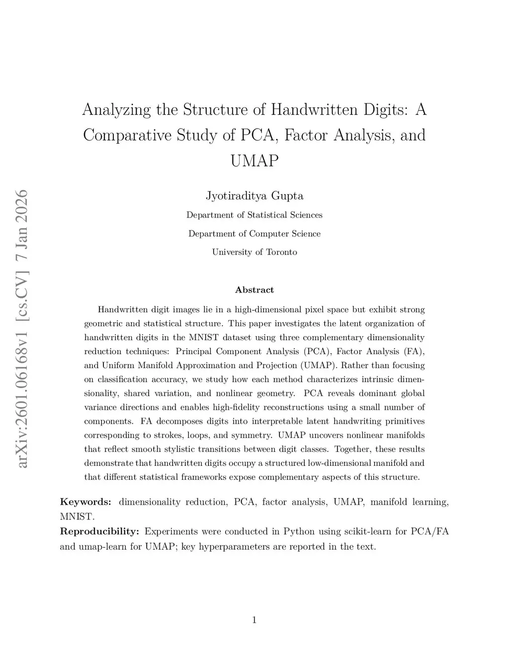 Analyzing the Structure of Handwritten Digits: A Comparative Study of PCA, Factor Analysis, and UMAP