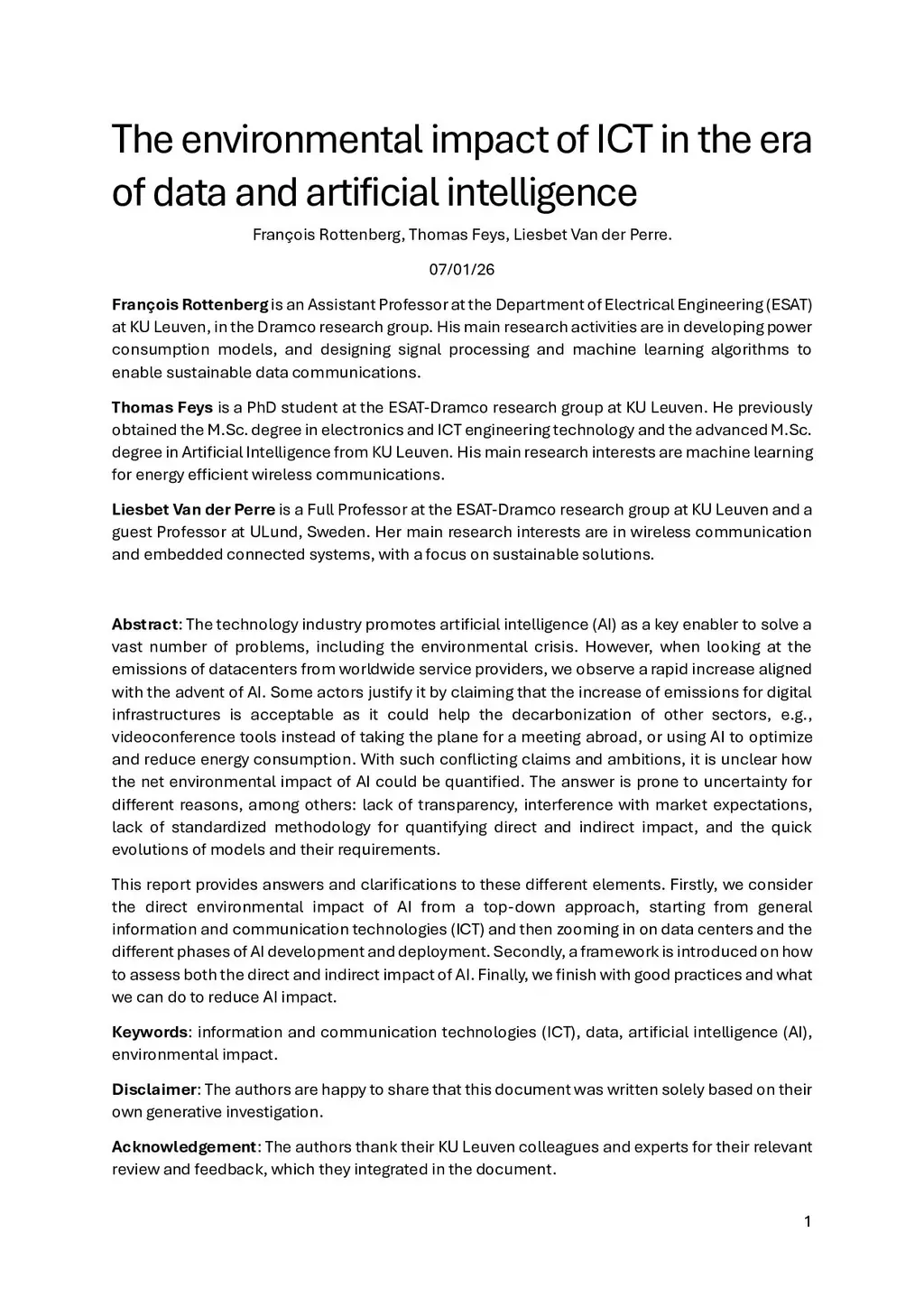 The technology industry promotes artificial intelligence (AI) as a key enabler to solve a vast number of problems, including the environmental crisis. However, when looking at the emissions of datacenters from worldwide service providers, we observe a rapid increase aligned with the advent of AI. Some actors justify it by claiming that the increase of emissions for digital infrastructures is acceptable as it could help the decarbonization of other sectors, e.g., videoconference tools instead of taking the plane for a meeting abroad, or using AI to optimize and reduce energy consumption. With such conflicting claims and ambitions, it is unclear how the net environmental impact of AI could be quantified. The answer is prone to uncertainty for different reasons, among others: lack of transparency, interference with market expectations, lack of standardized methodology for quantifying direct and indirect impact, and the quick evolutions of models and their requirements.This report provides answers and clarifications to these different elements. Firstly, we consider the direct environmental impact of AI from a top-down approach, starting from general information and communication technologies (ICT) and then zooming in on data centers and the different phases of AI development and deployment. Secondly, a framework is introduced on how to assess both the direct and indirect impact of AI. Finally, we finish with good practices and what we can do to reduce AI impact.
