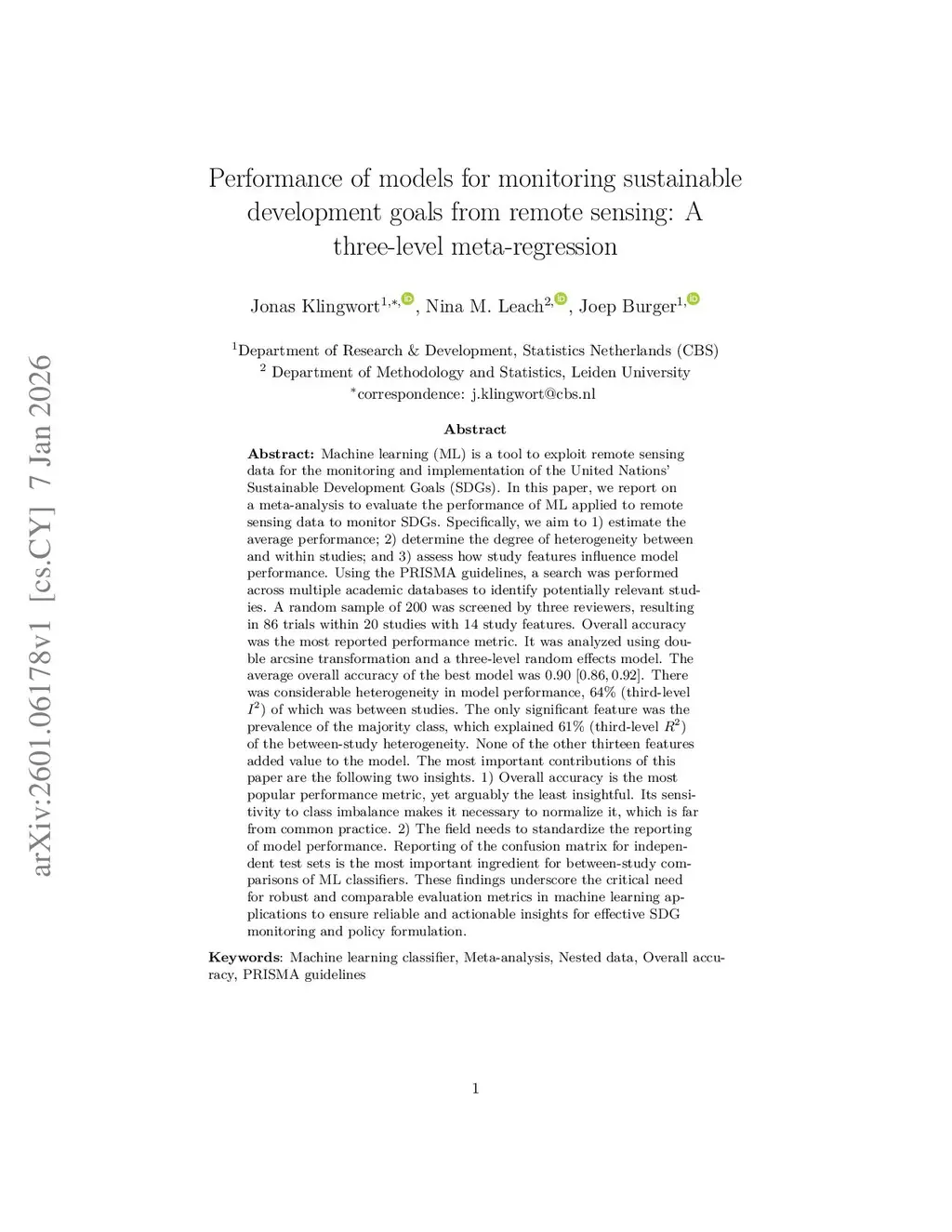Machine learning (ML) is a tool to exploit remote sensing data for the monitoring and implementation of the United Nations' Sustainable Development Goals (SDGs). In this paper, we report on a meta-analysis to evaluate the performance of ML applied to remote sensing data to monitor SDGs. Specifically, we aim to 1) estimate the average performance; 2) determine the degree of heterogeneity between and within studies; and 3) assess how study features influence model performance. Using PRISMA guidelines, a search was performed across multiple academic databases to identify potentially relevant studies. A random sample of 200 was screened by three reviewers, resulting in 86 trials within 20 studies with 14 study features. Overall accuracy was the most reported performance metric. It was analyzed using double arcsine transformation and a three-level random effects model. The average overall accuracy of the best model was 0.90 [0.86, 0.92]. There was considerable heterogeneity in model performance, 64% of which was between studies. The only significant feature was the prevalence of the majority class, which explained 61% of the between-study heterogeneity. None of the other thirteen features added value to the model. The most important contributions of this paper are the following two insights. 1) Overall accuracy is the most popular performance metric, yet arguably the least insightful. Its sensitivity to class imbalance makes it necessary to normalize it, which is far from common practice. 2) The field needs to standardize the reporting. Reporting of the confusion matrix for independent test sets is the most important ingredient for between-study comparisons of ML classifiers. These findings underscore the need for robust and comparable evaluation metrics in machine learning applications to ensure reliable and actionable insights for effective SDG monitoring and policy formulation.