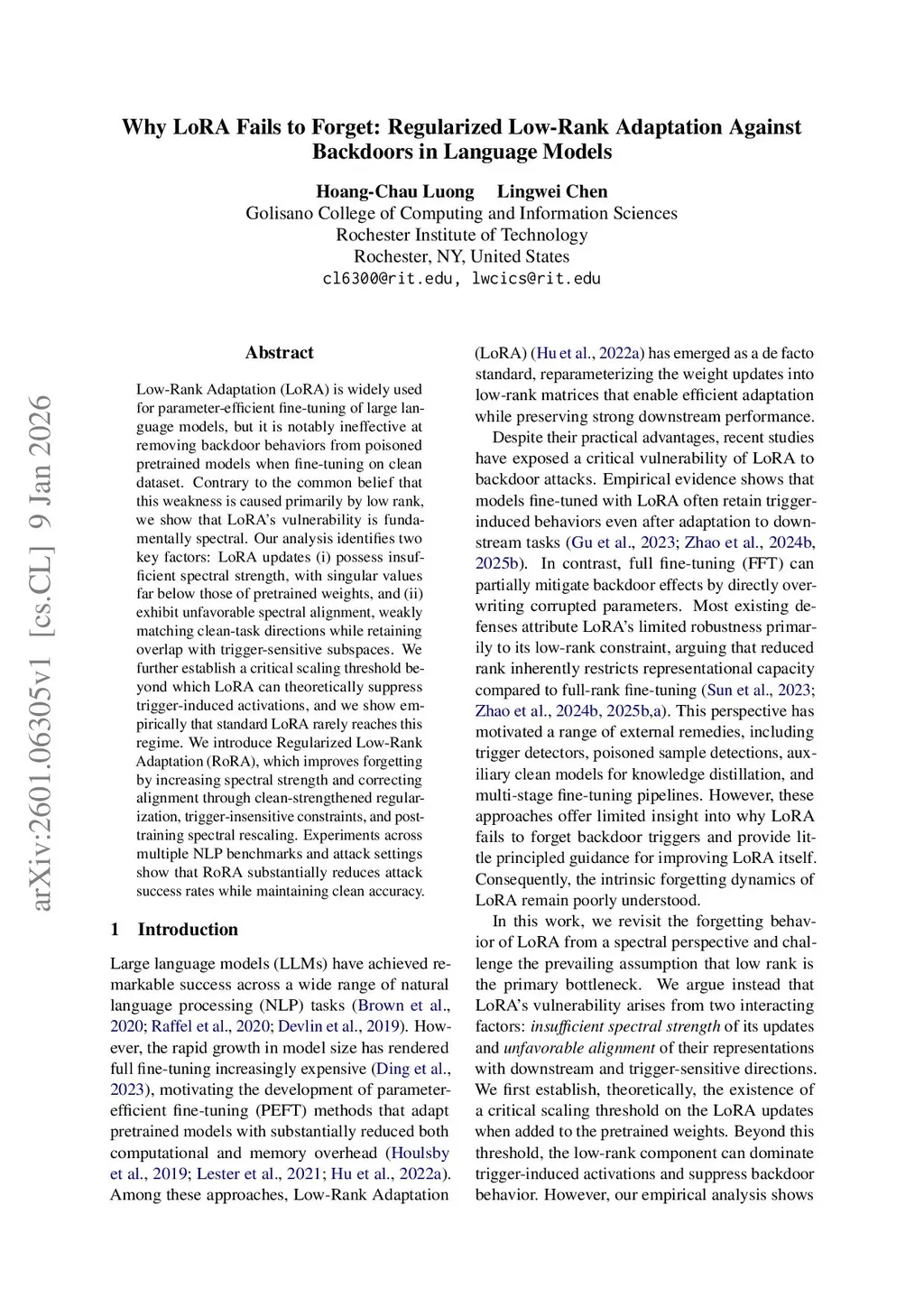 Low-Rank Adaptation (LoRA) is widely used for parameter-efficient fine-tuning of large language models, but it is notably ineffective at removing backdoor behaviors from poisoned pretrained models when fine-tuning on clean dataset. Contrary to the common belief that this weakness is caused primarily by low rank, we show that LoRA's vulnerability is fundamentally spectral. Our analysis identifies two key factors: LoRA updates (i) possess insufficient spectral strength, with singular values far below those of pretrained weights, and (ii) exhibit unfavorable spectral alignment, weakly matching clean-task directions while retaining overlap with trigger-sensitive subspaces. We further establish a critical scaling threshold beyond which LoRA can theoretically suppress trigger-induced activations, and we show empirically that standard LoRA rarely reaches this regime. We introduce Regularized Low-Rank Adaptation (RoRA), which improves forgetting by increasing spectral strength and correcting alignment through clean-strengthened regularization, trigger-insensitive constraints, and post-training spectral rescaling. Experiments across multiple NLP benchmarks and attack settings show that RoRA substantially reduces attack success rates while maintaining clean accuracy.