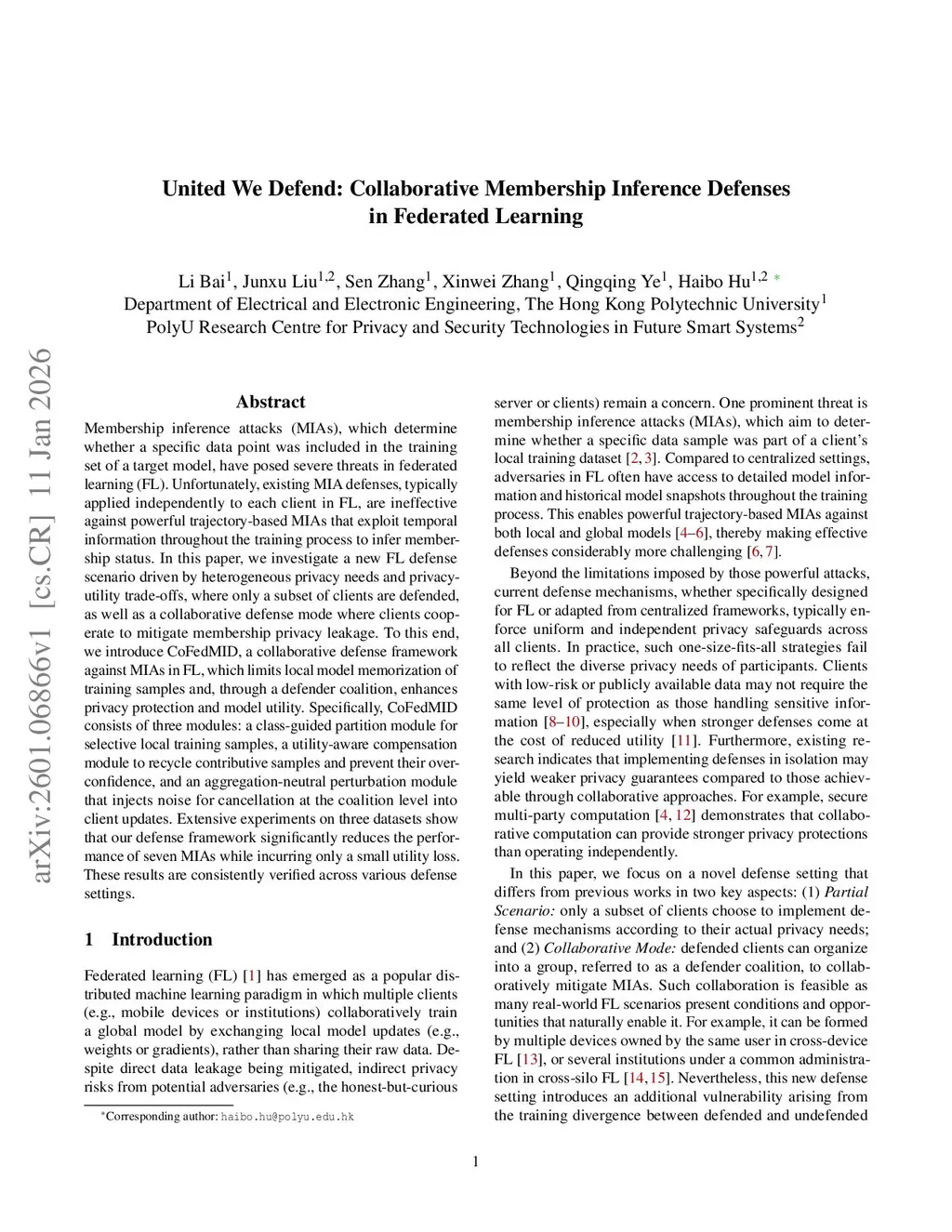 Membership inference attacks (MIAs), which determine whether a specific data point was included in the training set of a target model, have posed severe threats in federated learning (FL). Unfortunately, existing MIA defenses, typically applied independently to each client in FL, are ineffective against powerful trajectory-based MIAs that exploit temporal information throughout the training process to infer membership status. In this paper, we investigate a new FL defense scenario driven by heterogeneous privacy needs and privacy-utility trade-offs, where only a subset of clients are defended, as well as a collaborative defense mode where clients cooperate to mitigate membership privacy leakage. To this end, we introduce CoFedMID, a collaborative defense framework against MIAs in FL, which limits local model memorization of training samples and, through a defender coalition, enhances privacy protection and model utility. Specifically, CoFedMID consists of three modules: a class-guided partition module for selective local training samples, a utility-aware compensation module to recycle contributive samples and prevent their overconfidence, and an aggregation-neutral perturbation module that injects noise for cancellation at the coalition level into client updates. Extensive experiments on three datasets show that our defense framework significantly reduces the performance of seven MIAs while incurring only a small utility loss. These results are consistently verified across various defense settings.