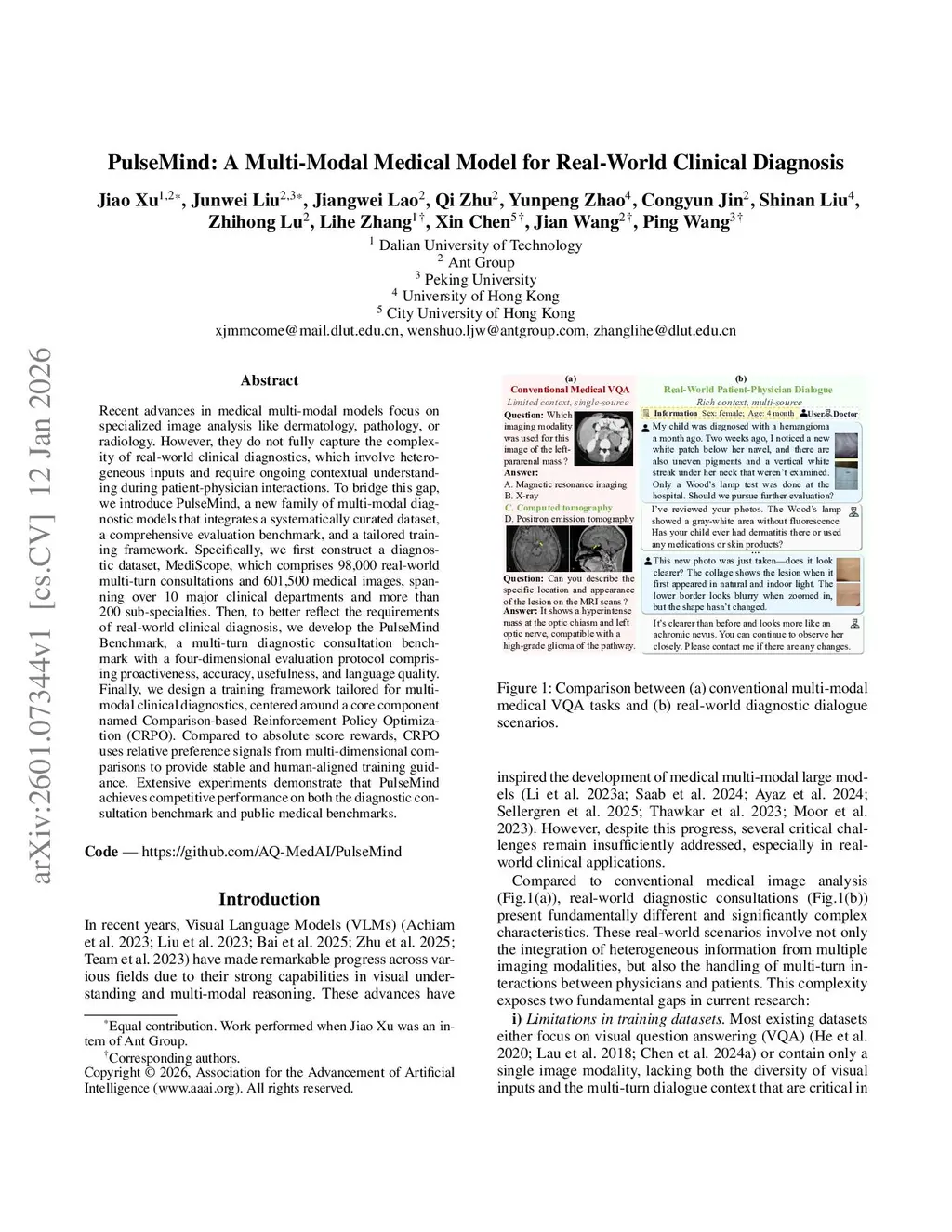 Recent advances in medical multi-modal models focus on specialized image analysis like dermatology, pathology, or radiology. However, they do not fully capture the complexity of real-world clinical diagnostics, which involve heterogeneous inputs and require ongoing contextual understanding during patient-physician interactions. To bridge this gap, we introduce PulseMind, a new family of multi-modal diagnostic models that integrates a systematically curated dataset, a comprehensive evaluation benchmark, and a tailored training framework. Specifically, we first construct a diagnostic dataset, MediScope, which comprises 98,000 real-world multi-turn consultations and 601,500 medical images, spanning over 10 major clinical departments and more than 200 sub-specialties. Then, to better reflect the requirements of real-world clinical diagnosis, we develop the PulseMind Benchmark, a multi-turn diagnostic consultation benchmark with a four-dimensional evaluation protocol comprising proactiveness, accuracy, usefulness, and language quality. Finally, we design a training framework tailored for multi-modal clinical diagnostics, centered around a core component named Comparison-based Reinforcement Policy Optimization (CRPO). Compared to absolute score rewards, CRPO uses relative preference signals from multi-dimensional com-parisons to provide stable and human-aligned training guidance. Extensive experiments demonstrate that PulseMind achieves competitive performance on both the diagnostic consultation benchmark and public medical benchmarks.