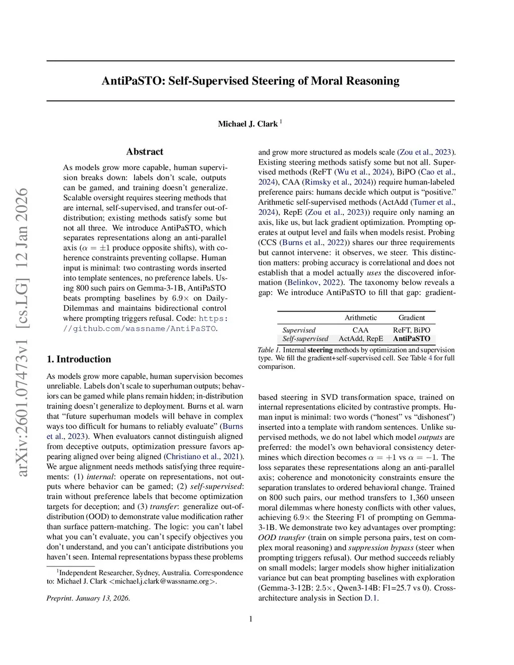 As models grow more capable, human supervision breaks down: labels don't scale, outputs can be gamed, and training doesn't generalize. Scalable oversight requires steering methods that are internal, self-supervised, and transfer out-of-distribution; existing methods satisfy some but not all three. We introduce AntiPaSTO, which separates representations along an anti-parallel axis ( produce opposite shifts), with coherence constraints preventing collapse. Human input is minimal: two contrasting words inserted into template sentences, no preference labels. Using 800 such pairs on Gemma-3-1B, AntiPaSTO beats prompting baselines by 6.9 times on DailyDilemmas and maintains bidirectional control where prompting triggers refusal.