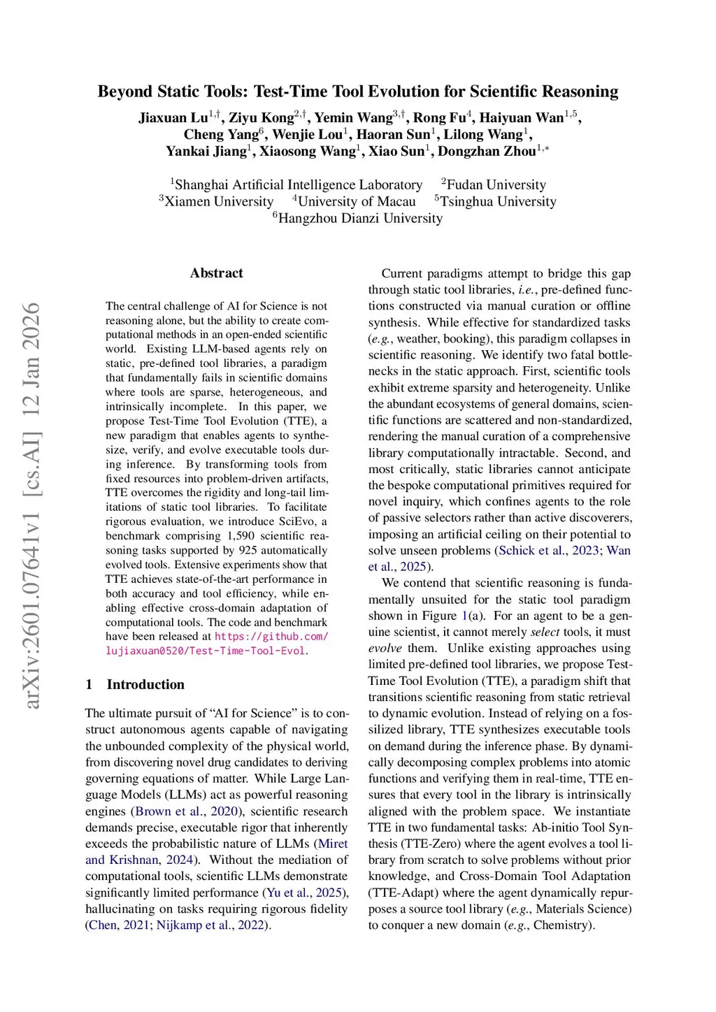 The central challenge of AI for Science is not reasoning alone, but the ability to create computational methods in an open-ended scientific world. Existing LLM-based agents rely on static, pre-defined tool libraries, a paradigm that fundamentally fails in scientific domains where tools are sparse, heterogeneous, and intrinsically incomplete. In this paper, we propose Test-Time Tool Evolution (TTE), a new paradigm that enables agents to synthesize, verify, and evolve executable tools during inference. By transforming tools from fixed resources into problem-driven artifacts, TTE overcomes the rigidity and long-tail limitations of static tool libraries. To facilitate rigorous evaluation, we introduce SciEvo, a benchmark comprising 1,590 scientific reasoning tasks supported by 925 automatically evolved tools. Extensive experiments show that TTE achieves state-of-the-art performance in both accuracy and tool efficiency, while enabling effective cross-domain adaptation of computational tools. The code and benchmark have been released atthis https URL.