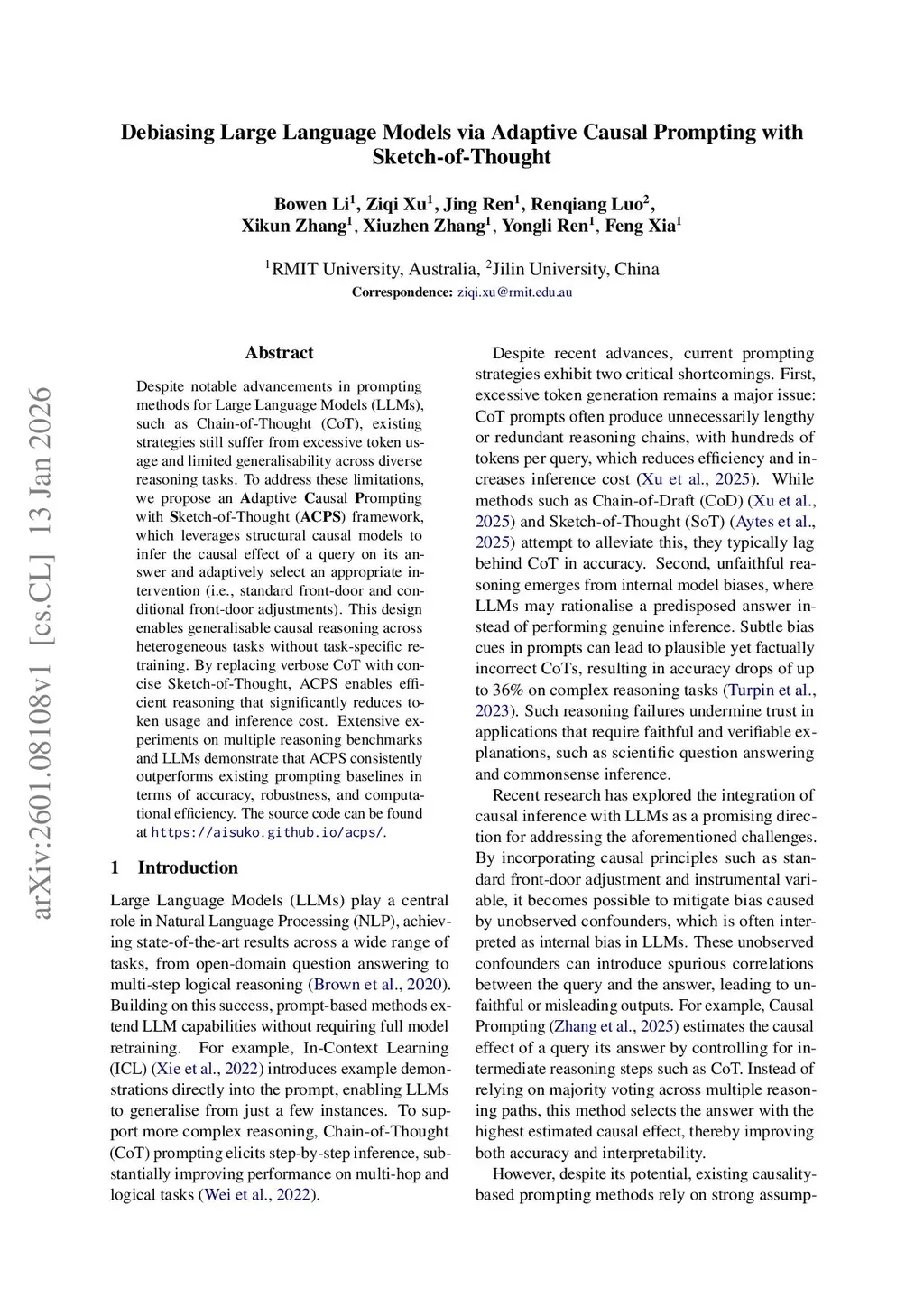 Despite notable advancements in prompting methods for Large Language Models (LLMs), such as Chain-of-Thought (CoT), existing strategies still suffer from excessive token usage and limited generalisability across diverse reasoning tasks. To address these limitations, we propose an Adaptive Causal Prompting with Sketch-of-Thought (ACPS) framework, which leverages structural causal models to infer the causal effect of a query on its answer and adaptively select an appropriate intervention (i.e., standard front-door and conditional front-door adjustments). This design enables generalisable causal reasoning across heterogeneous tasks without task-specific retraining. By replacing verbose CoT with concise Sketch-of-Thought, ACPS enables efficient reasoning that significantly reduces token usage and inference cost. Extensive experiments on multiple reasoning benchmarks and LLMs demonstrate that ACPS consistently outperforms existing prompting baselines in terms of accuracy, robustness, and computational efficiency.