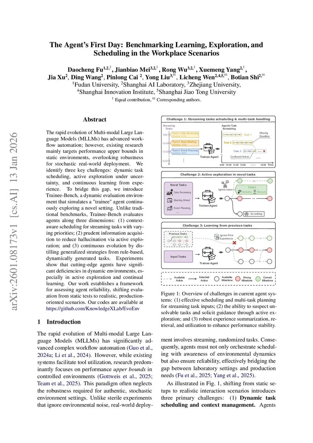 The rapid evolution of Multi-modal Large Language Models (MLLMs) has advanced workflow automation; however, existing research mainly targets performance upper bounds in static environments, overlooking robustness for stochastic real-world deployment. We identify three key challenges: dynamic task scheduling, active exploration under uncertainty, and continuous learning from experience. To bridge this gap, we introduce \method{}, a dynamic evaluation environment that simulates a "trainee" agent continuously exploring a novel setting. Unlike traditional benchmarks, \method{} evaluates agents along three dimensions: (1) context-aware scheduling for streaming tasks with varying priorities; (2) prudent information acquisition to reduce hallucination via active exploration; and (3) continuous evolution by distilling generalized strategies from rule-based, dynamically generated tasks. Experiments show that cutting-edge agents have significant deficiencies in dynamic environments, especially in active exploration and continual learning. Our work establishes a framework for assessing agent reliability, shifting evaluation from static tests to realistic, production-oriented scenarios. Our codes are available atthis https URL