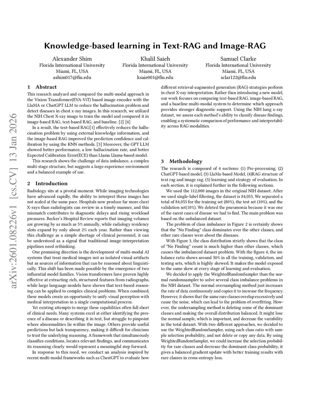 This research analyzed and compared the multi-modal approach in the Vision Transformer(EVA-ViT) based image encoder with the LlaMA or ChatGPT LLM to reduce the hallucination problem and detect diseases in chest x-ray images. In this research, we utilized the NIH Chest X-ray image to train the model and compared it in image-based RAG, text-based RAG, and baseline. [3] [5] In a result, the text-based RAG[2] e!ectively reduces the hallucination problem by using external knowledge information, and the image-based RAG improved the prediction con"dence and calibration by using the KNN methods. [4] Moreover, the GPT LLM showed better performance, a low hallucination rate, and better Expected Calibration Error(ECE) than Llama Llama-based model. This research shows the challenge of data imbalance, a complex multi-stage structure, but suggests a large experience environment and a balanced example of use.
