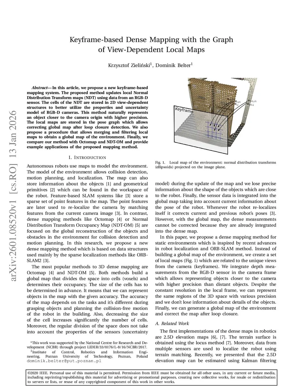 In this article, we propose a new keyframe-based mapping system. The proposed method updates local Normal Distribution Transform maps (NDT) using data from an RGB-D sensor. The cells of the NDT are stored in 2D view-dependent structures to better utilize the properties and uncertainty model of RGB-D cameras. This method naturally represents an object closer to the camera origin with higher precision. The local maps are stored in the pose graph which allows correcting global map after loop closure detection. We also propose a procedure that allows merging and filtering local maps to obtain a global map of the environment. Finally, we compare our method with Octomap and NDT-OM and provide example applications of the proposed mapping method.