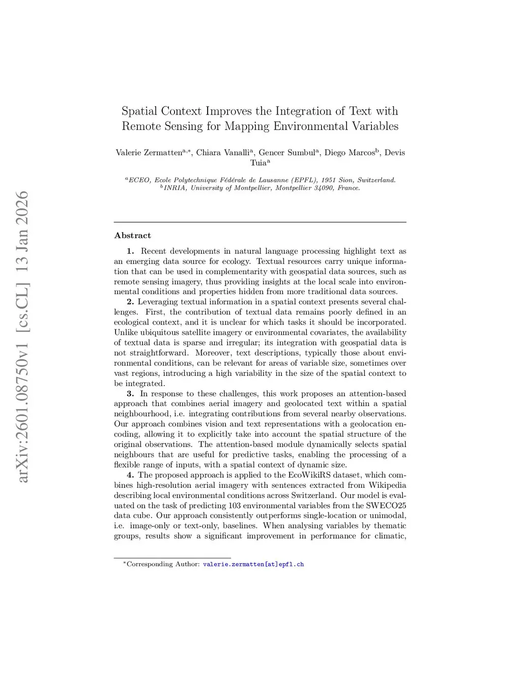 Recent developments in natural language processing highlight text as an emerging data source for ecology. Textual resources carry unique information that can be used in complementarity with geospatial data sources, thus providing insights at the local scale into environmental conditions and properties hidden from more traditional data sources. Leveraging textual information in a spatial context presents several challenges. First, the contribution of textual data remains poorly defined in an ecological context, and it is unclear for which tasks it should be incorporated. Unlike ubiquitous satellite imagery or environmental covariates, the availability of textual data is sparse and irregular; its integration with geospatial data is not straightforward. In response to these challenges, this work proposes an attention-based approach that combines aerial imagery and geolocated text within a spatial neighbourhood, i.e. integrating contributions from several nearby observations. Our approach combines vision and text representations with a geolocation encoding, with an attention-based module that dynamically selects spatial neighbours that are useful for predictivethis http URLproposed approach is applied to the EcoWikiRS dataset, which combines high-resolution aerial imagery with sentences extracted from Wikipedia describing local environmental conditions across Switzerland. Our model is evaluated on the task of predicting 103 environmental variables from the SWECO25 data cube. Our approach consistently outperforms single-location or unimodal, i.e. image-only or text-only, baselines. When analysing variables by thematic groups, results show a significant improvement in performance for climatic, edaphic, population and land use/land cover variables, underscoring the benefit of including the spatial context when combining text and image data.