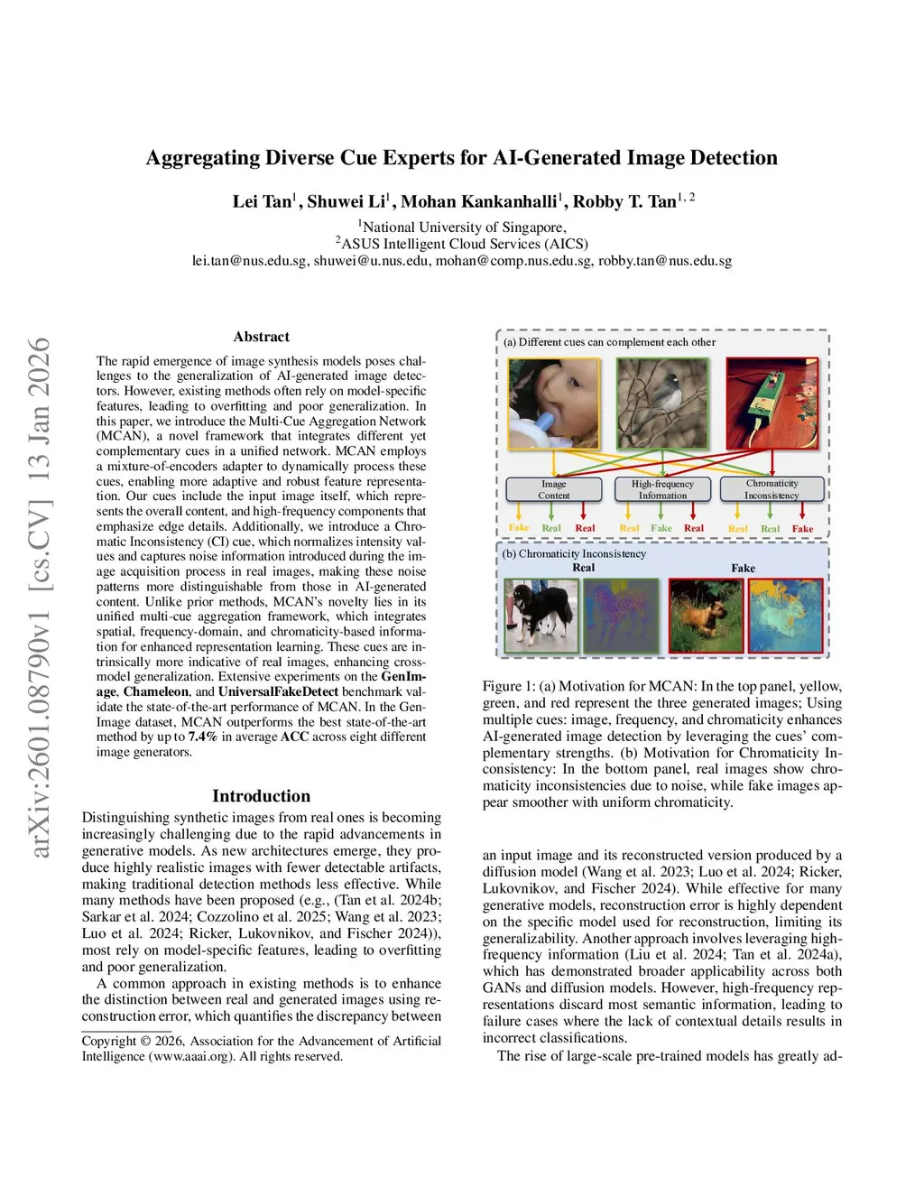 The rapid emergence of image synthesis models poses challenges to the generalization of AI-generated image detectors. However, existing methods often rely on model-specific features, leading to overfitting and poor generalization. In this paper, we introduce the Multi-Cue Aggregation Network (MCAN), a novel framework that integrates different yet complementary cues in a unified network. MCAN employs a mixture-of-encoders adapter to dynamically process these cues, enabling more adaptive and robust feature representation. Our cues include the input image itself, which represents the overall content, and high-frequency components that emphasize edge details. Additionally, we introduce a Chromatic Inconsistency (CI) cue, which normalizes intensity values and captures noise information introduced during the image acquisition process in real images, making these noise patterns more distinguishable from those in AI-generated content. Unlike prior methods, MCAN's novelty lies in its unified multi-cue aggregation framework, which integrates spatial, frequency-domain, and chromaticity-based information for enhanced representation learning. These cues are intrinsically more indicative of real images, enhancing cross-model generalization. Extensive experiments on the GenImage, Chameleon, and UniversalFakeDetect benchmark validate the state-of-the-art performance of MCAN. In the GenImage dataset, MCAN outperforms the best state-of-the-art method by up to 7.4% in average ACC across eight different image generators.