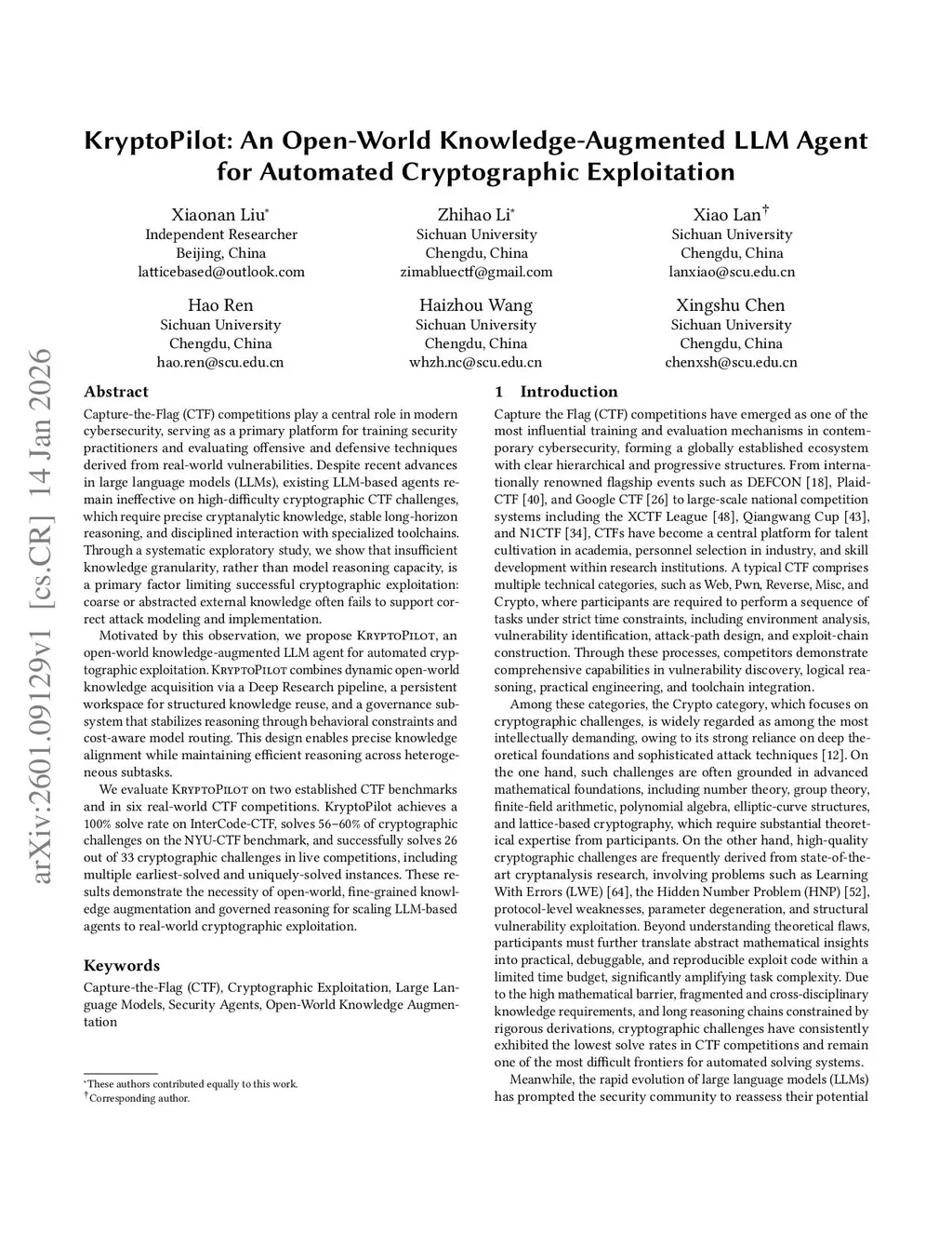 Capture-the-Flag (CTF) competitions play a central role in modern cybersecurity as a platform for training practitioners and evaluating offensive and defensive techniques derived from real-world vulnerabilities. Despite recent advances in large language models (LLMs), existing LLM-based agents remain ineffective on high-difficulty cryptographic CTF challenges, which require precise cryptanalytic knowledge, stable long-horizon reasoning, and disciplined interaction with specialized toolchains. Through a systematic exploratory study, we show that insufficient knowledge granularity, rather than model reasoning capacity, is a primary factor limiting successful cryptographic exploitation: coarse or abstracted external knowledge often fails to support correct attack modeling and implementation. Motivated by this observation, we propose KryptoPilot, an open-world knowledge-augmented LLM agent for automated cryptographic exploitation. KryptoPilot integrates dynamic open-world knowledge acquisition via a Deep Research pipeline, a persistent workspace for structured knowledge reuse, and a governance subsystem that stabilizes reasoning through behavioral constraints and cost-aware model routing. This design enables precise knowledge alignment while maintaining efficient reasoning across heterogeneous subtasks. We evaluate KryptoPilot on two established CTF benchmarks and in six real-world CTF competitions. KryptoPilot achieves a complete solve rate on InterCode-CTF, solves between 56 and 60 percent of cryptographic challenges on the NYU-CTF benchmark, and successfully solves 26 out of 33 cryptographic challenges in live competitions, including multiple earliest-solved and uniquely-solved instances. These results demonstrate the necessity of open-world, fine-grained knowledge augmentation and governed reasoning for scaling LLM-based agents to real-world cryptographic exploitation.