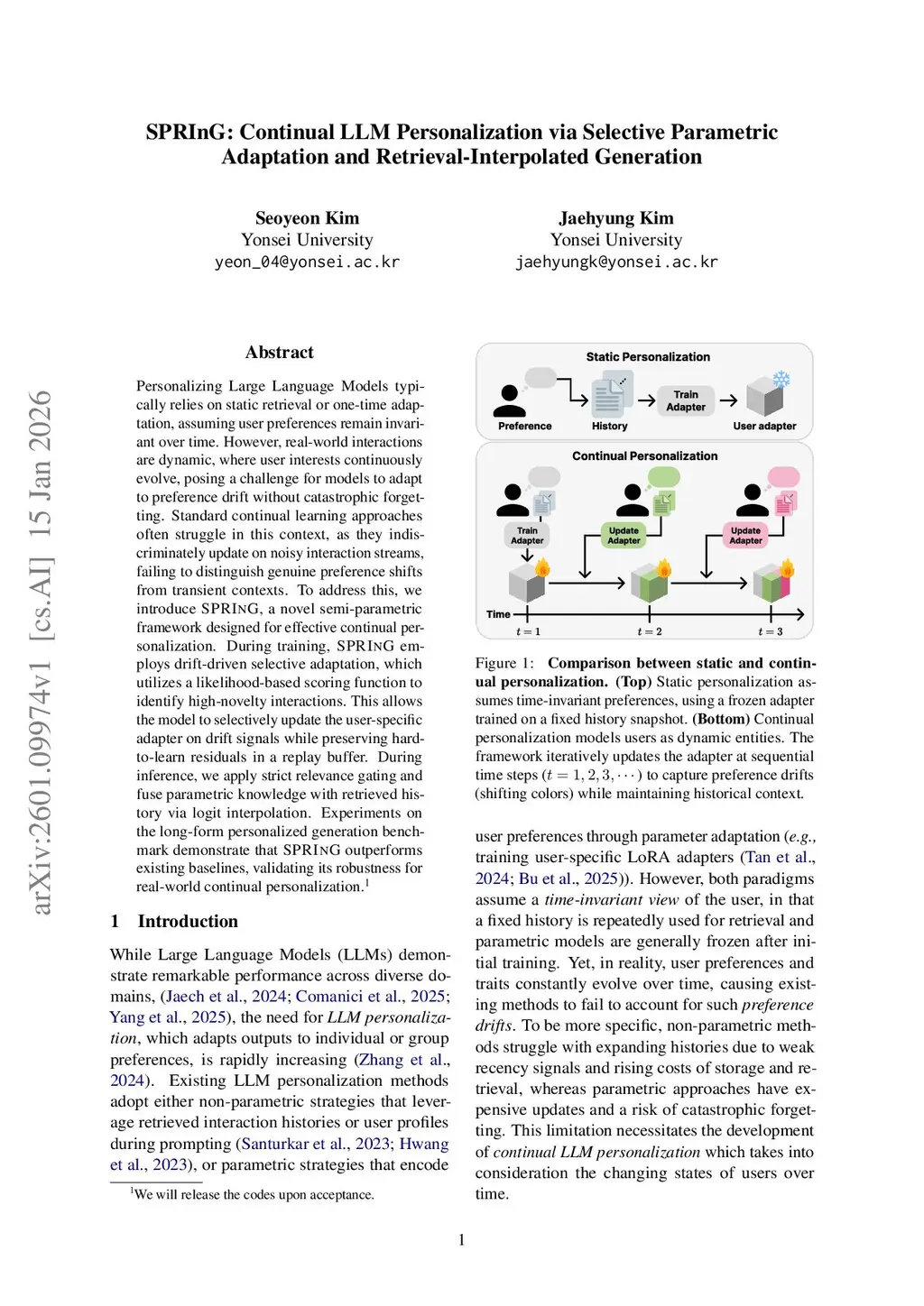Personalizing Large Language Models typically relies on static retrieval or one-time adaptation, assuming user preferences remain invariant over time. However, real-world interactions are dynamic, where user interests continuously evolve, posing a challenge for models to adapt to preference drift without catastrophic forgetting. Standard continual learning approaches often struggle in this context, as they indiscriminately update on noisy interaction streams, failing to distinguish genuine preference shifts from transient contexts. To address this, we introduce SPRInG, a novel semi-parametric framework designed for effective continual personalization. During training, SPRInG employs drift-driven selective adaptation, which utilizes a likelihood-based scoring function to identify high-novelty interactions. This allows the model to selectively update the user-specific adapter on drift signals while preserving hard-to-learn residuals in a replay buffer. During inference, we apply strict relevance gating and fuse parametric knowledge with retrieved history via logit interpolation. Experiments on the long-form personalized generation benchmark demonstrate that SPRInG outperforms existing baselines, validating its robustness for real-world continual personalization.