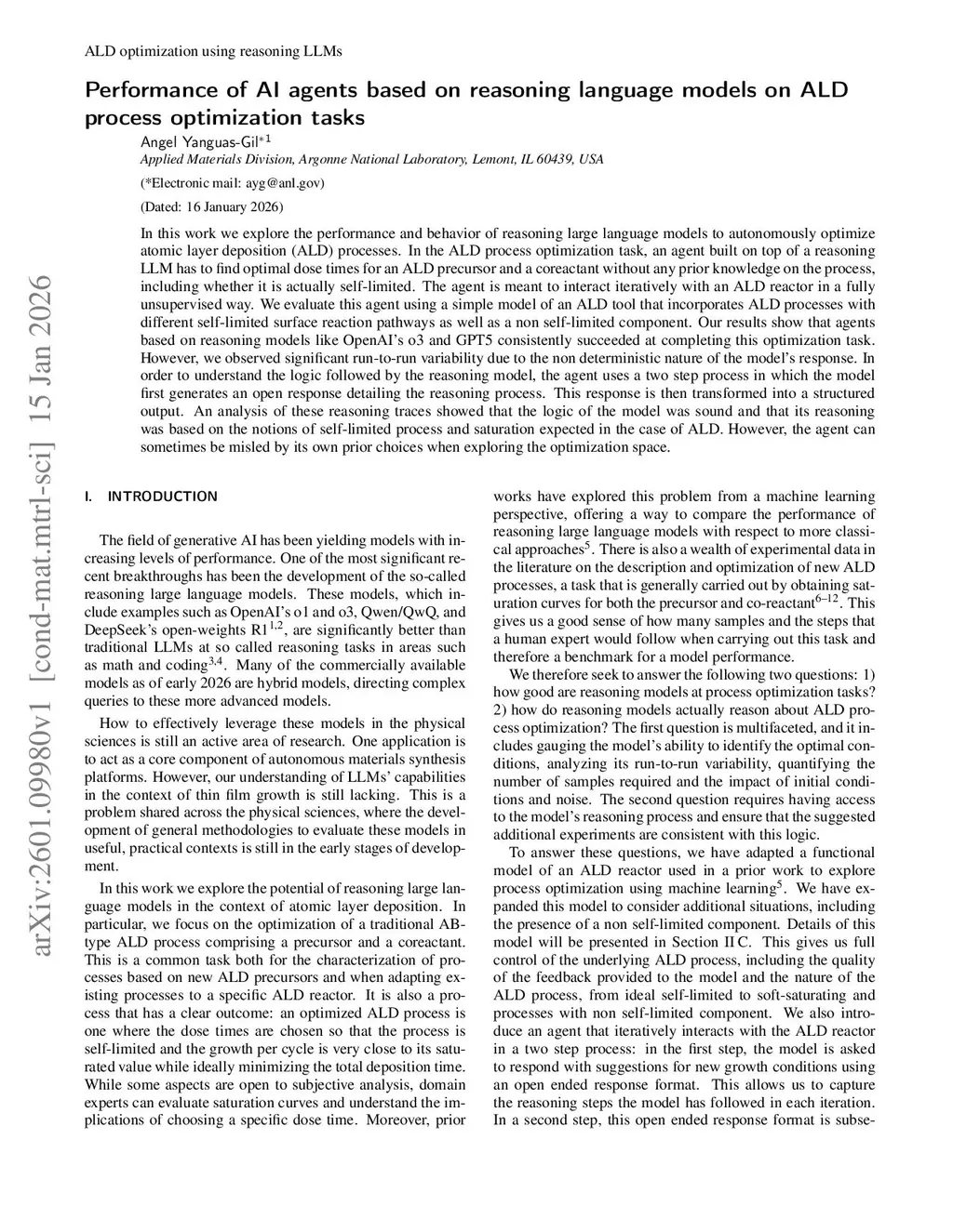 In this work we explore the performance and behavior of reasoning large language models to autonomously optimize atomic layer deposition (ALD) processes. In the ALD process optimization task, an agent built on top of a reasoning LLM has to find optimal dose times for an ALD precursor and a coreactant without any prior knowledge on the process, including whether it is actually self-limited. The agent is meant to interact iteratively with an ALD reactor in a fully unsupervised way. We evaluate this agent using a simple model of an ALD tool that incorporates ALD processes with different self-limited surface reaction pathways as well as a non self-limited component. Our results show that agents based on reasoning models like OpenAI's o3 and GPT5 consistently succeeded at completing this optimization task. However, we observed significant run-to-run variability due to the non deterministic nature of the model's response. In order to understand the logic followed by the reasoning model, the agent uses a two step process in which the model first generates an open response detailing the reasoning process. This response is then transformed into a structured output. An analysis of these reasoning traces showed that the logic of the model was sound and that its reasoning was based on the notions of self-limited process and saturation expected in the case of ALD. However, the agent can sometimes be misled by its own prior choices when exploring the optimization space.