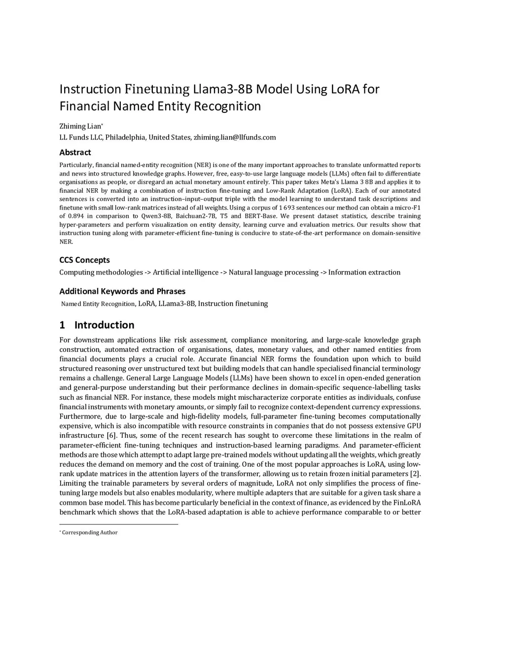 Instruction Finetuning LLaMA-3-8B Model Using LoRA for Financial Named Entity Recognition