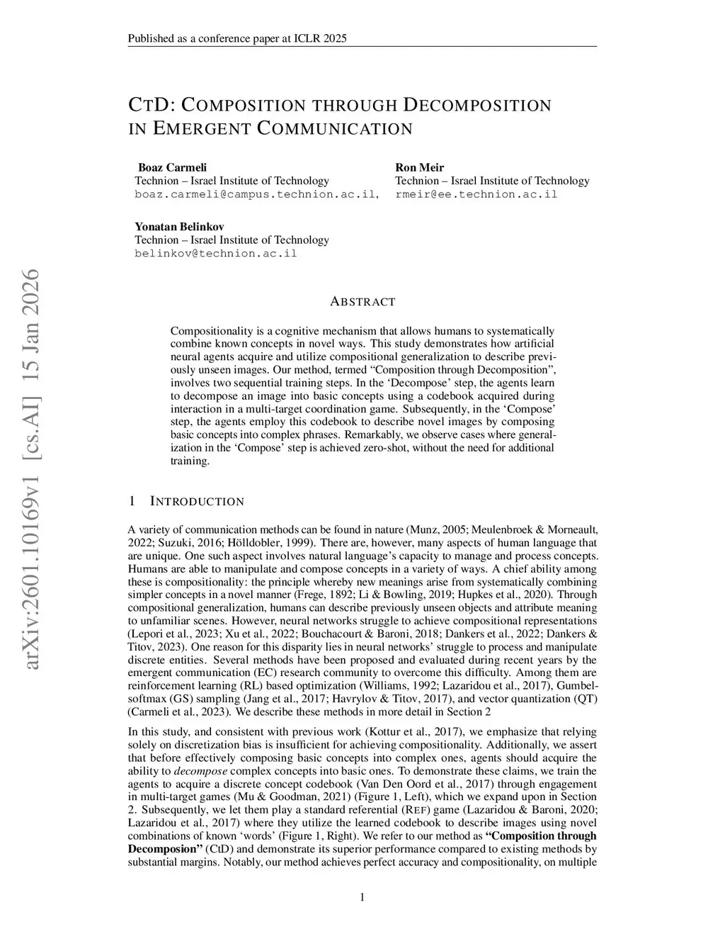Compositionality is a cognitive mechanism that allows humans to systematically combine known concepts in novel ways. This study demonstrates how artificial neural agents acquire and utilize compositional generalization to describe previously unseen images. Our method, termed "Composition through Decomposition", involves two sequential training steps. In the 'Decompose' step, the agents learn to decompose an image into basic concepts using a codebook acquired during interaction in a multi-target coordination game. Subsequently, in the 'Compose' step, the agents employ this codebook to describe novel images by composing basic concepts into complex phrases. Remarkably, we observe cases where generalization in the `Compose' step is achieved zero-shot, without the need for additional training.