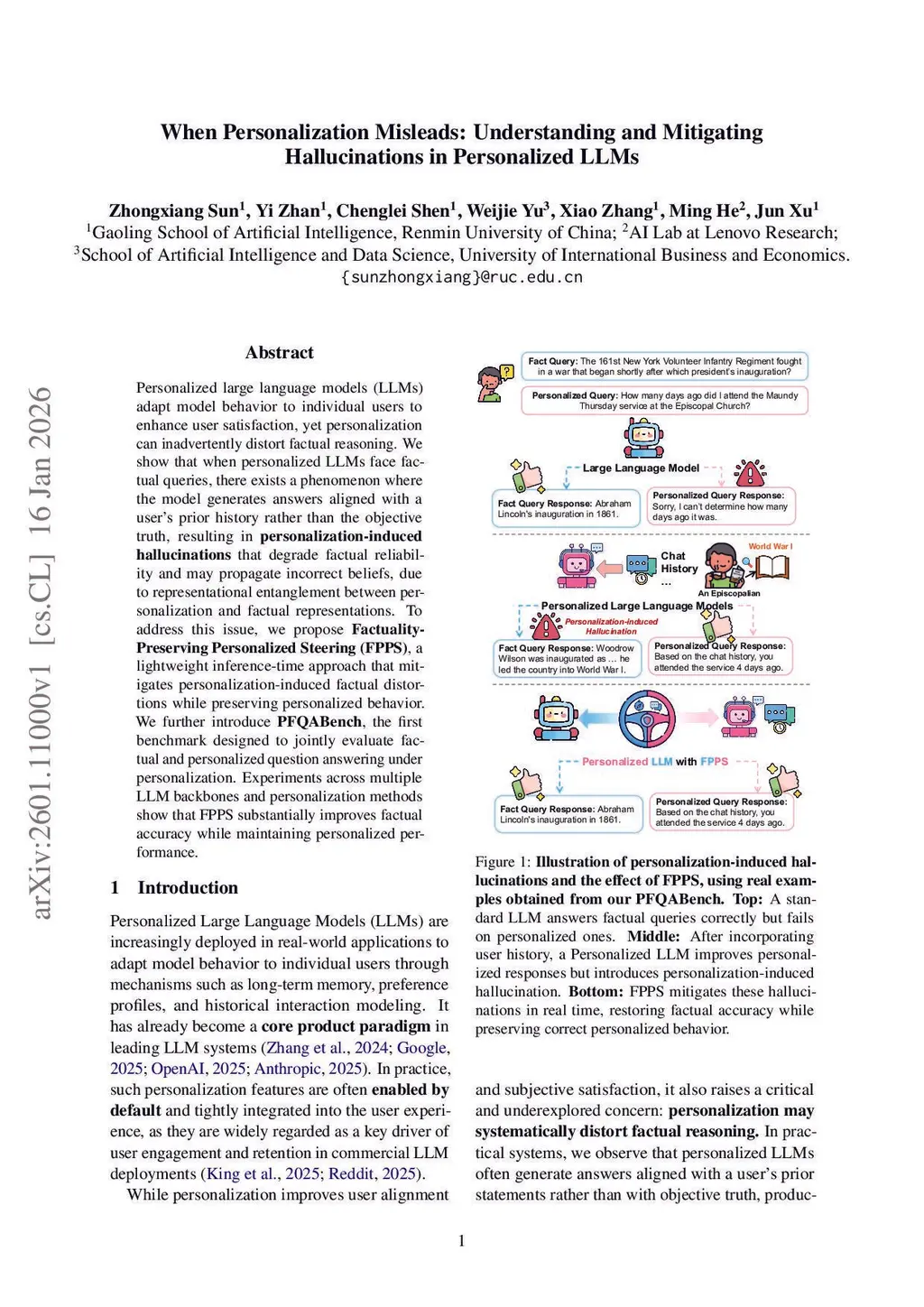 Personalized large language models (LLMs) adapt model behavior to individual users to enhance user satisfaction, yet personalization can inadvertently distort factual reasoning. We show that when personalized LLMs face factual queries, there exists a phenomenon where the model generates answers aligned with a user's prior history rather than the objective truth, resulting in personalization-induced hallucinations that degrade factual reliability and may propagate incorrect beliefs, due to representational entanglement between personalization and factual representations. To address this issue, we propose Factuality-Preserving Personalized Steering (FPPS), a lightweight inference-time approach that mitigates personalization-induced factual distortions while preserving personalized behavior. We further introduce PFQABench, the first benchmark designed to jointly evaluate factual and personalized question answering under personalization. Experiments across multiple LLM backbones and personalization methods show that FPPS substantially improves factual accuracy while maintaining personalized performance.